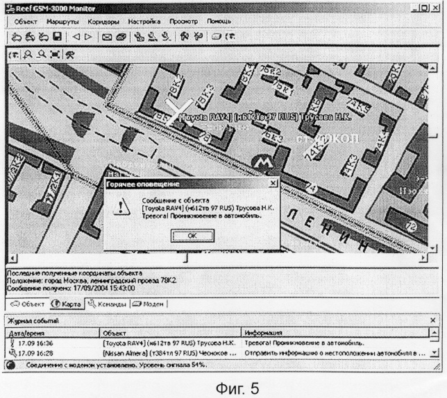 ПЦН 19 с подключенными к нему пультовым оконечным устройством 17 и блоком 21 хранения карты-схемы района, являющийся ключевым узлом центра 4 сбора и обработки информации, может быть выполнен в виде обычного персонального компьютера с программным обеспечением “REEF GSM-3000 MONITOR”, поставляемым предприятием-заявителем для корпоративных клиентов, например для автотранспортных предприятий. На борту ТС, принадлежащих такому автотранспортному предприятию, может быть установлена вышеупомянутая система “REEF GSM-3000” (как это указано, например, в статье “Мониторинг автопарка корпоративных клиентов”, опубликованной в журнале “12 Вольт”, № 10 (65), 2004, с.12-14, www.12voltmagazme.com). Назначение программы “REEF GSM-3000 MONITOR” – наблюдение за текущим местоположением и состоянием парка ТС, входящих в состав автотранспортного предприятия. Местонахождение ТС отображается специальными маркерами на электронной карте-схеме заданного района. Каждому маркеру соответствует текстовая строка, в которой указаны идентификационные признаки ТС: марка и государственный номер, фамилия, имя и отчество водителя (фиг.5). Размеры отображаемого фрагмента карты-схемы можно увеличивать и уменьшать. При увеличении масштаба отчетливо видны названия улиц, размеры и номера домов. В программном обеспечении предусмотрена возможность оповещения оператора ПЦН 19 о срабатывании возимого комплекса 8 охранной сигнализации. При этом в основном окне появляется текстовое извещение (сообщение с охраняемого ТС) с информацией о категории сообщения (ТРЕВОГА! ПРОНИКНОВЕНИЕ В АВТОМОБИЛЬ) и с идентификационными признаками охраняемого ТС (фиг.5).