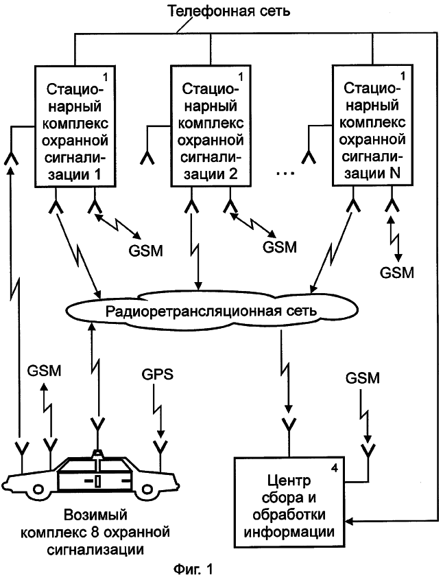Указанная система содержит установленные внутри охраняемых зданий стационарные комплексы охранной сигнализации, каждый из которых включает в себя охранные извещатели стационарные, связанные с помощью шлейфов с прибором приемно-контрольным, к первому и второму выходам которого подключены, соответственно, устройство оконечное радиоканальное, выполненное с возможностью передачи извещений по радиоретрансляционной сети, и передатчик сотовой сети, выполненный с возможностью передачи извещений по стандартной сотовой сети подвижной связи, например по GSM-сети. Система содержит также установленные на охраняемых ТС возимые комплексы охранной сигнализации. Каждый из них содержит охранные извещатели возимые, связанные с контроллером, первый выход которого подключен ко входу возимого устройства оконечного, выполненного с возможностью передачи извещений по радиоретрансляционной сети. В состав данной системы входит, кроме того, центр сбора и обработки информации, содержащий последовательно соединенные приемник сотовой сети, выполненный с возможностью приема извещений по стандартной сотовой сети подвижной связи, например по GSM-сети, и пультовое оконечное устройство, выполненное с возможностью приема извещений по радиоретрансляционной сети и передачи принятых извещений на ПЦН. ПЦН содержит адаптер ввода информации, первый вход которого служит для подключения к выходу пультового оконечного устройства, а выход подключен к сигнальному входу процессора обработки информации.