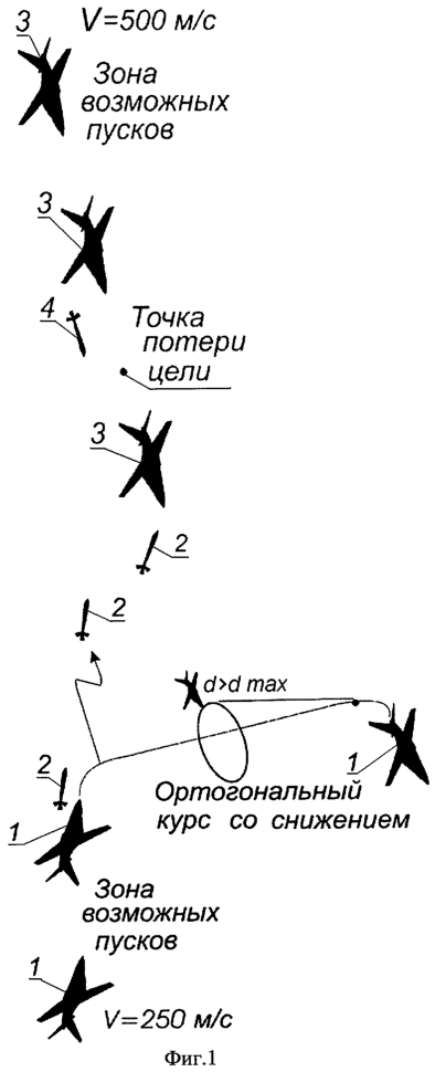 После обнаружения и захвата цели самолет 1 (фиг.1) производит пуск ракеты 2 по самолету-цели 3, осуществившему пуск ракеты, совершает тактический отворот на ортогональный курс траектории движения самолета-цели со снижением высоты полета.