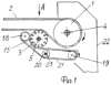 По мере износа каждое ребро 15 легко заменяется на новое, для чего снимается один из бандажей 17, а ребро 15 вынимается из клинового паза в торцевой стенке 16 отклоняющего барабана 3. Необходимое натяжение гибкой ленты 21 сообщается путем смещения вниз ролика 20 в направляющих 23.