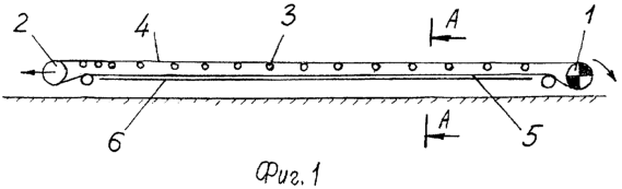 Ленточный конвейер состоит из бесконечно замкнутой на приводном 1 и натяжном 2 барабанах гибкой ленты, роликовых опор 3 на грузонесущей ветви 4 ленты и на холостой ветви 5 – опор скольжения 6. Опоры скольжения 6 (фиг.2 и 3) состоят из низкофрикционных элементов и несущей конструкции, которые выполнены в виде ориентированных по длине холостой ветви 5 ленты двух продольных полос 7 и 8, размещенных симметрично оси 9 конвейера. Полосы 7 и 8 установлены с углом наклона А=5-6 градусов в сторону от оси 9 конвейера. Расстояние l между продольными осями симметрии полос 7 и 8 принято равным (0,5-0,6) В, где В – ширина ленты, а ширина b полос 7 и 8 составляет (0,12-0,14) В.