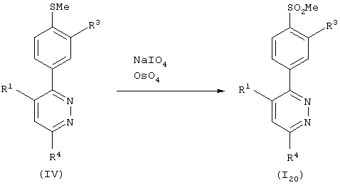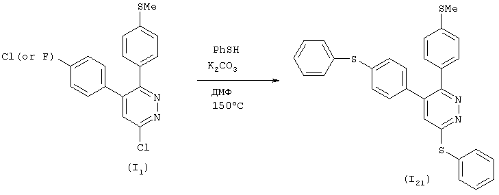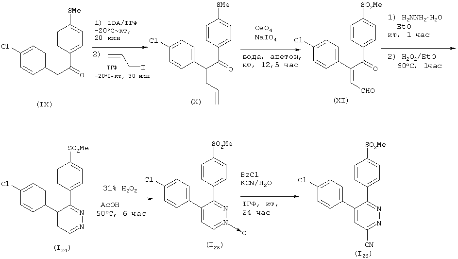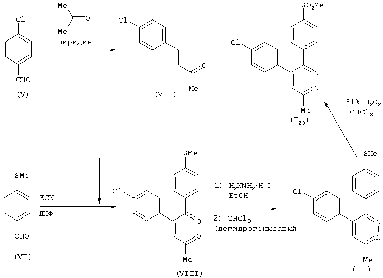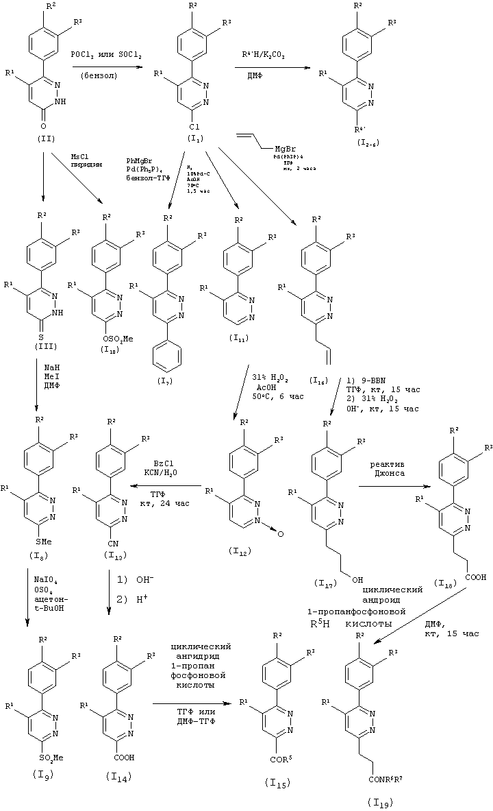 Область изобретения Настоящее изобретение касается соединений фенилпиридазина, обладающих превосходной ингибирующей активностью против производства интерлейкина-1 Известный уровень техники При многих заболеваниях, таких как ревматизм, артрит, остеопороз, воспалительный колит, синдром иммунодефицита, пиемия, гепатит, нефрит, ишемическая болезнь, инсулинзависимый сахарный диабет, артериальный склероз, болезнь Паркинсона, болезнь Альцгеймера и лейкоз, наблюдается стимуляция производства воспалительного цитокина, известного как интерлейкин-1 Из исследования, проведенного с применением рекомбинант данных ингибирующих биологическую активность веществ, анти-интерлейкин-1 Например, сообщается, что иммуносупрессоры и стероиды, применяемые для лечения ревматизма, ингибируют производство интерлейкина-1 Однако для всех этих соединений активность ингибирования производства интерлейкина-1 В последние годы исследования продвигаются с возрастающей активностью и сфокусированы на ингибирующем действии против производства интерлейкина-1 Однако ни одно из таких соединений не демонстрирует достаточную ингибирующую активность против производства интерлейкина-1 С другой стороны, известно, что разнообразные производные 5,6-дифенилпиридазина оказывают обезболивающее и противовоспалительное действие (Eur. J. Med. Chem., 14, 53060, 1979). Однако абсолютно ничего не известно в отношении ингибирующей активности данных производных 5,6-дифенилпиридазина против производства интерлейкина-1 В последние годы в JP 7-69894, WO 9841511, WO 9910331, WO 9910332, WO 9925697 и WO 9944995 раскрыты некоторые производные пиридазина, как обладающие ингибирующей активностью против производства интерлейкина-1 Таким образом, одной целью настоящего изобретения является обеспечение соединения, обладающего превосходной ингибирующей активностью против производства интерлейкина-1 Краткое описание изобретения Настоящее изобретение касается соединений пиридазина, представленных общей формулой (I), обладающих превосходной ингибирующей активностью против производства интерлейкина-1 А именно, настоящее изобретение относится к соединению фенилпиридазина, которое представлено следующей формулой (I): где R1 представляет замещенную или незамещенную фенильную группу или замещенную или незамещенную пиридильную группу; R2 представляет низшую алкоксигруппу, низшую алкилтиогруппу, низшую алкилсульфинильную группу или низшую алкилсульфонильную группу; R3 представляет атом водорода или низшую алкоксигруппу; или R2 и R3 вместе могут быть конденсированы, образуя алкилендиоксигруппу; R4 представляет водород, галоген, циано, карбоксил, замещенный или незамещенный низший алкил, замещенный или незамещенный низший алкенил, замещенный или незамещенный низший алкилтио, замещенный или незамещенный низший алкилсульфинил, замещенный или незамещенный низший алкилсульфонил, замещенный или незамещенный низший алкилсульфонилокси, замещенный или незамещенный арил, замещенный или незамещенный ароматический гетероцикл, замещенный или незамещенный фенокси, замещенный или незамещенный фенилтио, замещенный или незамещенный фенилсульфинил, замещенный или незамещенный фенилсульфонил, замещенный или незамещенный пиридилокси, замещенный или незамещенный морфолино, замещенный или незамещенный морфолинокарб