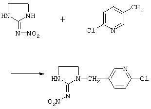 Данное изобретение касается нового способа получения известных гетероциклических соединений. Известен способ получения ненасыщенных гетероциклических соединений алкилированием атомов незамещенных циклических соединений, который может проводиться в том числе в спирте (европейская заявка на патент ЕР-А-259 738). Также известны реакции алкилирования в апротонных растворителях (европейская заявка на патент ЕР-А-259 738). В этих случаях, чтобы достичь достаточной чистоты, необходима последующая очистка продукта, кроме того, достигаемые в известных процессах выходы целевого продукта являются неудовлетворительными. Найдено, что соединения формулы (I) в которой R1 представляет собой атом водорода или алкильную группу, А представляет собой этиленовую группу, которая может быть замещена алкилом, или триметиленовую группу, которая может быть замещена алкилом, D представляет собой нитро или циано группу, Х представляет собой атом кислорода или серы, или группу R3 представляет собой атом водорода или алкильную группу, и Z представляет собой, при необходимости, замещенную 5- или 6-членную гетероциклическую группу, которая содержит, по крайней мере, два гетероатома, выбранных из атомов кислорода, серы и азота, или, при необходимости, замещенную 3 или 4-пиридильную группу, получают взаимодействием соединений формулы (II) в которой A, D и Х имеют указанные выше значения, с основанием в присутствии разбавителя с последующим взаимодействием реакционной смеси со смесью из ХХМП/ХМП (2-хлор-5-хлорметилпиридин/2-хлор-5-метилпиридин) с соответствующими гидрохлоридами. В соответствии с изобретением неожиданно установлено, что вышеназванные соединения могут производиться более простым, с меньшим числом стадий способом и с лучшим выходом. В общих формулах (I) и (II) указанные радикалы имеют следующие значения: R1 предпочтительно означает водород или алкил с 1-3 атомами углерода, особенно предпочтительно – водород; А предпочтительно означает этиленовую или триметиленовую группу, которые соответственно могут быть замещены алкильными группами с 1-3 атомами углерода, особенно предпочтительно этиленовую группу; D означает нитро или циано, Х предпочтительно означает атома кислорода или серы или группу особенно предпочтительно – атом кислорода или группу Z предпочтительно означает галогенированную 5- или 6-членную гетероциклическую группу, которая содержит два гетероатома, выбранных из группы кислорода, серы и азота, или галогенированный 3- или 4-пиридил, особенно предпочтительно – галогенированные триазолил или 3-пиридил, совершенно особенно предпочтительно – 2-хлор-пирид-5-ил. Особенно предпочтительным соединением формулы (I) является соединение формулы (Ia) полученное взаимодействием соединения формулы (IIa) с основанием в присутствии разбавителя с последующим взаимодействием реакционной смеси со смесью из ХХМП/ХМП с соответствующими гидрохлоридами. Наиболее предпочтительным соединением формулы (I) является соединение формулы (Ib) полученное взаимодействием соединения формулы (IIb) с основанием в присутствии разбавителя с последующим взаимодействием реакционной смеси со смесью из ХХМП/ХМП с соответствующими гидрохлоридами. В качестве растворителя могут использоваться протонные и диполярно-апротонные растворители, в частности вода, спирты, кетоны (преим