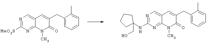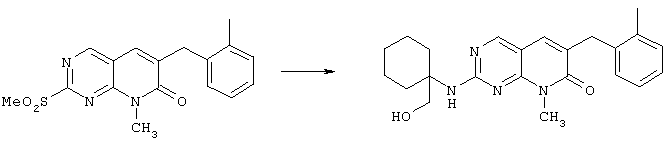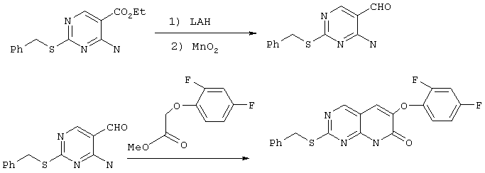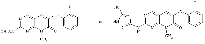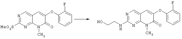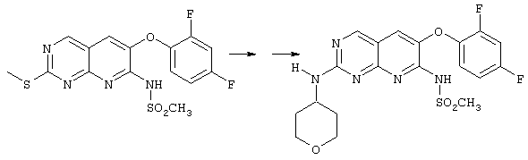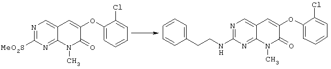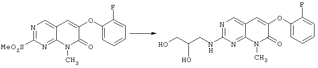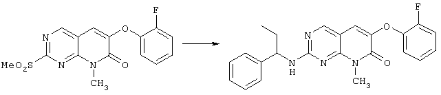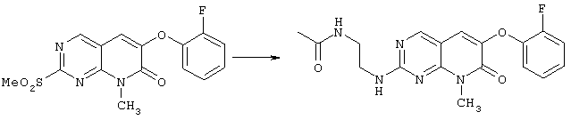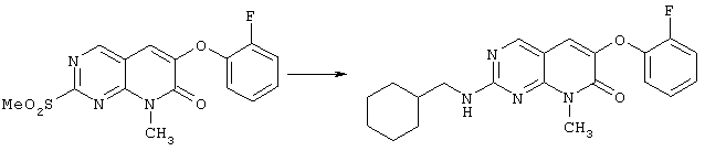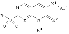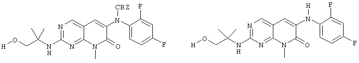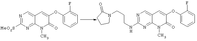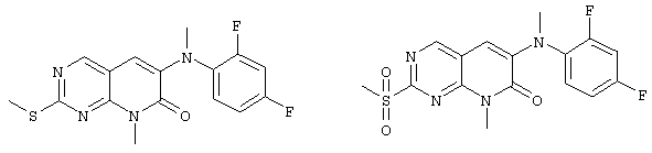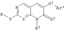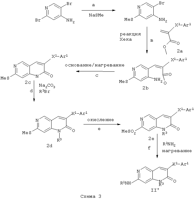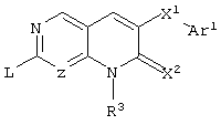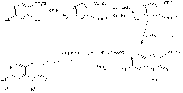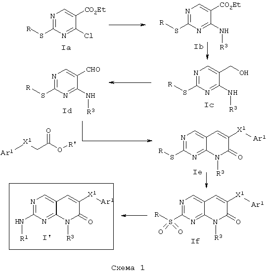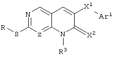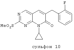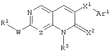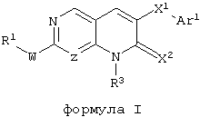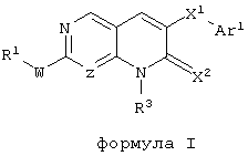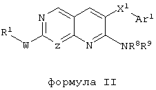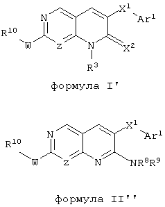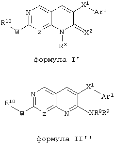 Настоящее изобретение относится к пиридопиримидинам и их производным. В частности, настоящее изобретение предоставляет 2,6-дизамещенные 7-оксопиридо[2,3-d]пиримидины, способ их получения, фармацевтические препараты, включающие их, и способы их применения. Митоген-активированные протеинкиназы (МАП-киназы) относятся к семейству пролин-направленных серин/треонин-киназ, которые активируют их субстраты путем двойственного фосфорилирования. Киназы активируются разнообразными сигналами, включая пищевую и осмотическую нагрузку, УФ-свет, ростовые факторы, эндотоксин и воспалительные цитокины. Одной из групп МАП-киназ является группа киназ р38, которая включает различные изоформы (например, р38 Более того, показано, что продукты фосфорилирования р38 являются промежуточными при продуцировании воспалительных цитокинов, включая фактор некроза опухоли (TNF) и интерлейкин (IL-1), и циклооксигеназы-2. Каждый из этих цитокинов вовлечен в целый ряд болезней и болезненных состояний. Например, TNF- TNF также вовлечен в вирусные инфекции, как, например, ВИЧ, вирус гриппа и вирус герпеса, включая тип-1 вируса простого герпеса (HSV-1), тип-2 вируса простого герпеса (HSV-2), цитомегаловирус (CMV), вирус ветряной оспы (VZV), вирус Эпштейна-Барра, вирус-6 герпеса человека (HHV-6), вирус-7 герпеса человека (HHV-7), вирус-8 герпеса человека (HHV-8), ложное бешенство и ринотрахеит, среди прочего. Подобным образом IL-1 продуцируется активированными моноцитами и макрофагами и играет роль во многих патофизиологических ответных реакциях, включая ревматоидный артрит, лихорадку и понижение костной резорбции. Кроме того, вовлечение р38 в патологический процесс имеет своим последствием удар, болезнь Альцгеймера, остеоартрит, поражение легких, септический шок, ангиогенез, дерматит, псориаз и атопический дерматит (см., например, J. Exp. Opin. Ther. Patents, (2000) 10 (1)). Подавление этих цитокинов путем ингибирования киназы р38 оказывает благоприятное воздействие для регулирования, ослабления и облегчения многих из этих болезненных состояний. Обнаружено согласно международной заявке на патент WO 96/34867, что некоторые 6-арилпиридо[2,3-(1]пиримидин-7-оны, -7-имины и -7-тионы являются ингибиторами опосредствованной протеин-тирозин-киназой клеточной пролиферации. Другие 6-арилпиридо[2,3-d]пиримидины и нафтиридины также раскрываются как ингибиторы тирозинкиназы в международной заявке на патент WO 96/15128. 6-Алкил-пиридо[2,3-d]пиримидин-7-оны раскрываются как ингибиторы циклин-зависимых киназ в международной заявке на патент WO 98/33798. Некоторые 4-аминопиридо-пиримидины раскрываются как ингибиторы дигидрофолатредуктазы в заявке на европейский патент ЕР 0278686 А1. По одному из аспектов настоящее изобретение обеспечивает соединения, представленные формулой I и II (краткое изложение сущности изобретения): или их фармацевтически приемлемые соли, где: Z означает N или СН; W означает NR2; Х1 означает О, NR4 (где R4 означает водород или алкил), S или CR5R6 (где R5 и R6 независимо друг от друга означают водород или алкил), или С=O; X2 означает О или NR7; Ar1 означает арил или гетероарил; R2 означает водород, алкил, ацил, алкоксикарбонил, арилоксикарбонил, гетероалкилкарбонил, гетероалкилоксикарбонил или -R21 -R22, где R21 означает алкилен или -С(=O)и R22 означает алкил или алкоксил; R1 означает водород, алкил, галоидалкил, арил, аралкил, гетероарил, гетероаралкил, циклоалкил, ц
