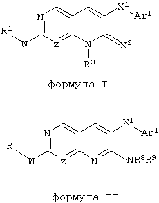 1. Производное пиридопиримидинов формулы I или II или его фармацевтически приемлемые соли, где Z означает N или СН; W означает NR2; X1 означает О, NR4 (где R4 означает водород или алкил), S или CR5R6 (где R5 и R6 означают водород); X2 означает О; Ar1 означает незамещенный или замещенный фенил; R2 означает водород, алкил или ацил; R1 означает водород, алкил, галоидалкил, арил, аралкил, гетероарил, гетероаралкил, циклоалкил, циклоалкилалкил, гетероалкилзамещенный циклоалкил, гетерозамещенный циклоалкил, гетероалкил, цианоалкил, гетероциклил, гетероциклилалкил, R12-SO2-гетероциклоаминогруппу (где R12 означает арил или аралкил), -Y1-C(O)-Y2-R11 (где Y1 и Y2 независимо либо отсутствуют, либо являются алкиленовой группой и R11 означает алкил, алкоксил, амино-, моноалкиламино- или диалкиламиногруппу), замещенный пиперазинил или морфолинил; R3 означает алкил, циклоалкил, арил, амино-, моноалкиламино- или диалкиламиногруппу; R8 и R9 означают независимо друг от друга водород, алкилсульфонил, -C(O)-R81 (где R81 означает моно- или диалкиламиногруппу). 2. Производное пиридопиримидинов по п.1, где Z означает N или СН; W означает NR2; X1 означает О, NR4 (где R4 означает водород или алкил), S или CR5R6 (где R5 и R6 означают водород); X2 означает О; Ar1 означает незамещенный или замещенный фенил; R2 означает водород или алкил; R1 означает водород, алкил, галоидалкил, арил, аралкил, циклоалкил, циклоалкилалкил, гетероалкилзамещенный циклоалкил, гетерозамещенный циклоалкил, гетероалкил, цианоалкил, гетероциклил, гетероциклилалкил, -Y1-C(O)-Y2-R11 (где Y1 и Y2 независимо либо отсутствуют, либо являются алкиленовой группой и R11 означает алкил, алкоксил, амино-, моноалкиламино- или диалкиламиногруппу), замещенный пиперазинил или морфолинил; R3 означает алкил, циклоалкил, арил, амино-, моноалкиламино- или диалкиламиногруппу; R8 и R9 означают независимо друг от друга водород, алкилсульфонил, -C(O)-R81 (где R81 означает моно- или диалкиламиногруппу). 3. Производное пиридопиримидинов по п.1 или 2, где Z означает N. 4. Производное пиридопиримидинов по любому из пп.1-3, где W означает NH. 5. Производное пиридопиримидинов по любому из пп.1-4, где Ar1 означает необязательно замещенный фенил 6. Производное пиридопиримидинов по любому из пп.1-5, где X1 означает О или СН2. 7. Производное пиридопиримидинов по любому из пп.1-6, где X1 означает О. 8. Производное пиридопиримидинов по любому из пп.1-7, где R1 означает арил, аралкил, циклоалкил, циклоалкилалкил, гетероалкилзамещенный циклоалкил, гетерозамещенный циклоалкил, гетероалкил, гетероциклил или гетероциклилалкил. 9. Производное пиридопиримидинов по любому из пп.1-8, где R1 означает гетероалкилзамещенный циклоалкил, гетерозамещенный циклоалкил, гетероалкил или гетероциклил. 10. Производное пиридопиримидинов по любому из пп.1-9, где R1 означает гетероциклил. 11. Производное пиридопиримидинов по любому из пп.1-9, где R1 означает гетероалкил. 12. Производное пиридопиримидинов по любому из пп.1-11, где Ar1 означает 2-замещенный фенил, 4-замещенный фенил или 2,4-дизамещенный фенил. 13. Производное пиридопиримидинов по любому из пп.1-12, где Ar1 означает 2-хлорфенил, 2-фторфенил, 2-метилфенил, 2-фтор-4-метилфенил или 2,4-дифторфенил. 14. Производное пиридопиримидинов по любому из пп.1-13 формулы I, где Х означает О и R3 означает метил, пропил или циклопропил, предпочтительно метил. 15. Производное пиридопиримидинов по любому из пп.1-13 формулы II, где R8 означает в