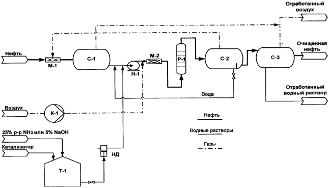 Нефть, прошедшая предварительную подготовку (сепарацию, обессоливание, обезвоживание) и содержащая 300-600 ppm сероводорода, нагретая до температуры 20-70°С (предпочтительно 45-55°С), поступает в сепаратор С-1. Из С-1 насосом Н-1 нефть под давлением 0,6-2,5 МПа подают в реактор окисления колонного типа Р-1. На всас насоса Н-1 из емкости Т-1 дозировочным насосом НД подают расчетное количество (предпочтительно 0,5-5 кг/т) раствора фталоцианинового катализатора в 5-10%-ном растворе NaOH или в 25%-ном водном растворе аммиака. В поток нефти после насоса Н-1 компрессором К-1 подают под давлением 0,6-2,5 МПа сжатый воздух, который растворяется в нефти. Далее смесь поступает в реактор Р-1 колонного типа. В реакторе происходит окисление сероводорода кислородом растворенного в нефти воздуха: .