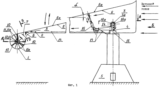 Флюгер-балка 3 энергетической установки имеет возможность изменять положение по углу относительно направления ветрового потока приводом 15 и фиксироваться в стопорном состоянии (при выполнении работ по обслуживанию установки) по вертикальной оси 4 посредством тормозного устройства 16 (например, тормозных колодок), а по горизонтальной оси 4а тормозным устройством 16а.