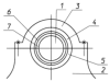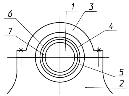 Отсоединяли крышку 3 роторной машины 2 и вынимали верхнюю половинку 4 корпуса подшипника. Нижнюю половинку корпуса 5 вынимали после удаления вала 1. Верхнюю и нижнюю половинки 4, 5 корпуса соединяли стяжными элементами (на чертеже не показано) и на токарном станке удаляли антифрикционный слой 7, совместно с удалением слоя металла корпуса. При этом выдерживали диаметральный размер обрабатываемой окружности, с учетом: номинального диаметра (d) вала в месте установки подшипника, толщины ( ) применяемых ремонтных вкладышей и радиального зазора ( r) между антифрикционным слоем ремонтных вкладышей и валом насоса, после чего обе половинки 4, 5 корпуса рассоединяли, вкладывали в каждую половинку по ремонтному вкладышу, обеспечивая посадку в пределах Н7/m6-Н7/р6.