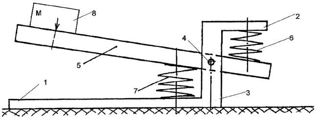 Собственная частота колебаний системы определяется массой М виброизолируемого объекта 8 и соотношением плеч рычага 5 от оси шарнира 4 до осей упругих элементов 6 и 7, а также от оси приложения нагрузки от виброизолируемого объекта 8 до оси шарнира 4. Такое расположение упругих элементов 6 и 7 позволяет уменьшить жесткость виброизолятора в целом, поскольку перемещение объекта во столько раз больше перемещения верхнего фланца упругого элемента 6, во сколько раз больше отношение плеч рычага от оси приложения нагрузки от виброизолируемого объекта 8 до оси шарнира 4 и от оси шарнира до оси упругого элемента 6.