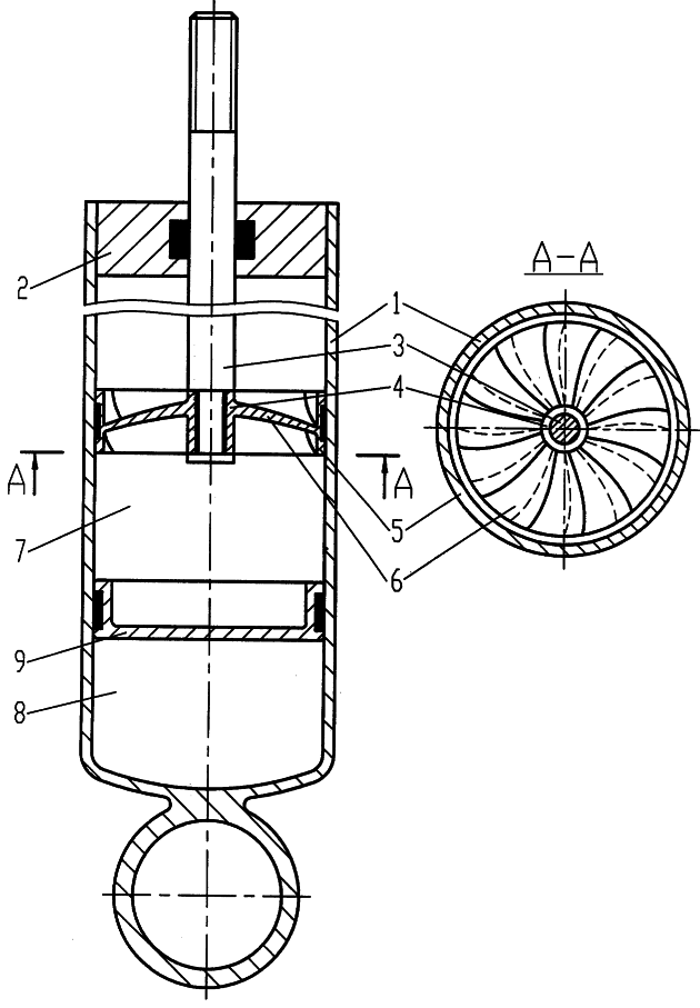 Амортизатор работает следующим образом. При сжатии или отбое с началом движения штока 3, а вместе с ним и крыльчатки соответственно вниз или вверх возникает разность давлений рабочей жидкости в нижней и верхней частях гидравлической полости 7. Вследствие этой разности образуется результирующая сила давления, оказывающая воздействие на крыльчатку в двух направлениях. В вертикальном направлении эта сила оказывает сопротивление продвижению штока 3, а в горизонтальном она вращает крыльчатку.