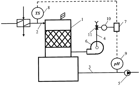 Входящая в систему подготовки подпиточной воды теплосети на тепловой электростанции установка содержит декарбонизатор 1 с подключенными к нему трубопроводами обрабатываемой 2 и декарбонизированной 3 воды и воздуховодом 4. В трубопровод 3 включен насос декарбонизированной воды 5, а в воздуховод 4 вентилятор 6. Установка снабжена регулятором расхода воздуха 7, который соединен с датчиком-реле температуры 8 на трубопроводе обрабатываемой воды и датчиком остаточного содержания растворенного диоксида углерода 9 в декарбонизированной воде, а также с исполнительным механизмом 10 регулирующего органа 11 на воздуховоде атмосферного воздуха. В качестве датчика 9 может быть использован рН-метр с преобразователем показаний рН в значения концентрации диоксида углерода, а в качестве регулятора расхода воздуха 7 на сегодняшний день наиболее целесообразно применять регулятор Ремиконт-130. Ремиконт представляет собой микропроцессорное устройство управления, архитектура которого оптимизирована для решения задач автоматического регулирования технологических процессов. Ремиконт является программируемым устройством: реализуемые им алгоритмы управления и конфигурация связей жестко не фиксированы и могут задаваться и изменяться непосредственно на месте эксплуатации. В комплекте с ремиконтами могут использоваться обычные датчики и исполнительные механизмы, которые подключаются к ним с помощью индивидуальных кабельных связей. Сигналы, поступающие в ремиконты, обрабатываются в цифровой форме.