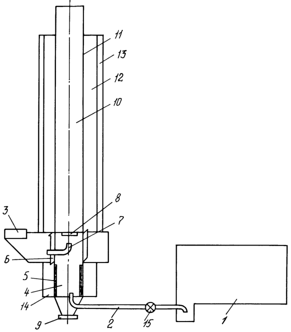 Устройство содержит источник жидкого топлива 1, соединенный с ним топливопровод 2, воздухоподающее устройство 3. Топливопровод 2 входит в нижнюю часть камеры сжигания 4, внутри которой по стенке расположены стабилизаторы вращения топлива 5. Камера для сжигания 4 в верхней части выполнена в виде крыльчатки 6 и снабжена патрубком для подачи воздуха по центру камеры 7, над которым установлен рассекатель факела 8. Внизу камера сжигания имеет съемное днище 9 для удаления накопившихся негорючих остатков. Над камерой сжигания установлен теплообменник 10, выполняющий функции – продолжение камеры сжигания, основного элемента теплопередачи и удаление продуктов сгорания. Теплообменник 10, установленный над камерой сгорания состоит из цилиндрической трубы 11, водяной рубашки 12 и утеплителя 13, служащего для уменьшения потерь тепла. Камера сжигания также снабжена водяной рубашкой 14. На топливопроводе 2 установлен запорный вентиль 15.