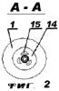 Для предотвращения в процессе эксплуатации нагрева установленного на входе в цилиндрический корпус 1 углепластикового подшипника 5 в отделяющей входной патрубок 3 от рабочей полости цилиндрического корпуса 1 крышке 14 выполнены аксиально ориентированные фасолевидные отверстия 15 (см. фиг.2). Через указанные отверстия входной поток подается непосредственно в цилиндрический корпус 1 предложенного теплового генератора.