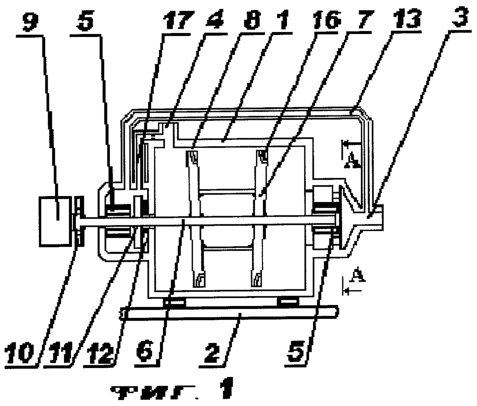 С целью снижения габаритов предложенного теплового генератора в качестве его двигателя 9 целесообразно использовать фланцевый двигатель 9 (обычно электродвигатель), консольно сопряженный с выполненным на выходе вала 6 фланца 10. В этом случае может быть обеспечена работа устройства на высоких оборотах без использования более мощного крупногабаритного двигателя, потребляющего больше энергии и требующего для своей установки больше площади, нежели малогабаритный и энергоэкономичный фланцевый двигатель.