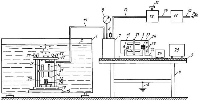 При этом давлении РИЗБ=0,9 кг/см2 автопилотный блок выдерживается в течение заданного времени, например 5 мин, и проводится при этом визуальная индикация, нет ли выделения пузырьков воздуха при этом в местах предполагаемой негерметичности. Если есть необходимость, для дополнительного осмотра блок может быть снят с подставки 19 и повернут рукой в нужную сторону. Одновременно с визуальной индикацией проводится наблюдение за изменением установленного давления РИЗБ по показанию манометра 8, не изменяется ли оно в сторону уменьшения. Таким образом, это позволяет определить герметичность блока одновременно по двум показателям: опрессовкой воздухом (избыточным давлением) с фиксацией утечки по манометру и по выделению пузырьков воздуха в среде жидкости.