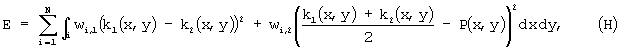 где k1(x,y) и k2(x,y) – главные значения кривизны поверхности f в точке (х,у), и dxdy – элемент площади поверхности i. Заранее определенные весовые коэффициенты wi,1 и wi,2 зависят от х и y и, возможно, от f и первых производных f.