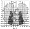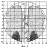 Характеристики линзы согласно изобретению приведены в Таблице 1, и ее изоцилиндрическая и силовая карты показаны на фиг.2 и 3 соответственно. Номинальная добавленная оптическая сила, обеспечиваемая линзами, составляет 2,00 диоптрии. Можно видеть, что канал, имеющий более низкую диоптрическую силу, от 0 до 1,25 диоптрий, занимают в линзе широкую зону, от y=0 до приблизительно y=-12 мм. Линзу оптимизируют для рабочей дальности 40-80 см, обычного расстояния от глаз до экрана компьютера. Линзу конструируют с использованием вышеописанного алгоритма. Длину канала регулируют, задавая градиент оптической силы канала равным 0,11 дптр/мм, который является дополнительным входным параметром алгоритма. Длину канала задают равной 18 мм, ширину зоны дистанционного видения – 20 мм, и ширину зоны ближнего видения – 14 мм.