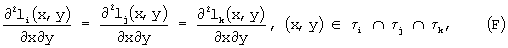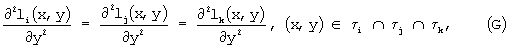 Как показано в статье Agryis et al., ограничения на непрерывность, выражаемые уравнениями (B)-(G), эквивалентны удовлетворению непрерывности f, ее первых производных и вторых производных в вершинах треугольников i, и непрерывности производной f по отношению к перпендикулярам, проведенным в средних точках сторон треугольников. Для всего множества треугольников ограничения на непрерывность, выражаемые уравнениями (B)-(G), эквивалентны ограничениям на непрерывность (Н) в каждой вершине и ограничению на непрерывность для каждой средней точки. Точные значения f, ее первых производных и вторых производных в вершинах совместно с точным значением f по отношению к перпендикуляру, проведенному в каждой средней точке, являются свободными параметрами или степенями свободы.