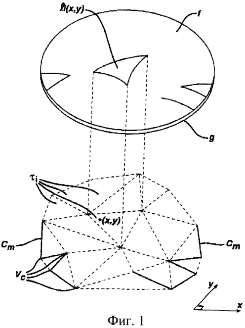 Поверхность может выражаться и предпочтительно выражается в виде стыкованных между собой многочленов пятой степени, заданных на треугольниках i так, чтобы поверхность удовлетворяла ограничениям на непрерывность, выражаемым уравнениями (B)-(G), согласно методу, описанному в статье Argyis, J.H. et al., The TUBA Family of Plate Elements for the Matrix Displacement Method, Aeronautical J., vol.732, 701-709, включенной в полном объеме в настоящее описание посредством ссылки. Составляют Ns многочленов пятой степени Sk(x,y), которые удовлетворяют ограничениям на непрерывность, выражаемым уравнениями (В)-(G). Поверхность представляют в виде линейной комбинации этих многочленов формы, которая задается уравнением: