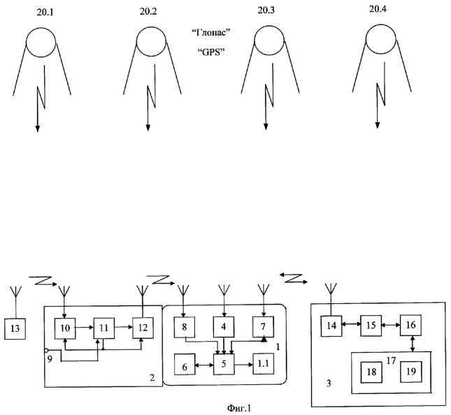 Бортовая аппаратура транспортного средства 1 предназначена для контроля за состоянием груза, определения текущих координат транспортного средства и обмена информацией о состоянии водителя, транспортного средства и груза с ИАЦ 3. БАТС 1 содержит приемоизмеритель 4 радионавигационной системы “Глонас” или “GPS” с антенной, блок 5 сопряжения, пульт 6 сигнальных сообщений, приемопередатчик 7 дуплексной радиосвязи с антенной, приемник 8 кодовых сигналов от охранной сигнализации 2, испольнительный блок 1.1.