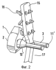 Фиг.4 показывает вид сзади настенного держателя 1. На изображении видно, как направляющие элементы 7 закреплены внутри крепления 2. Направляющие элементы 7 выступают через направляющие шлицы 5 внутрь крепления 2. На направляющие элементы 7 насажены несущие элементы 13 и зафиксированы пружинными кольцами 14, поэтому они не могут соскользнуть с направляющих элементов 7 вниз.
