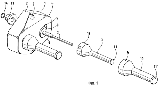 5. Держатель по п.4, отличающийся тем, что изогнутые направляющие шлицы (5) одной пары направляющих шлицев расположены так, что наклон касательной в точке изгиба соответствующего направляющего шлица, в которой оба направляющих шлица имеют наименьшее расстояние друг от друга, по величине больше, чем наклон касательной во всех других точках изгиба направляющего шлица, и наклоны касательных в обеих точках наименьшего расстояния имеют разные знаки.