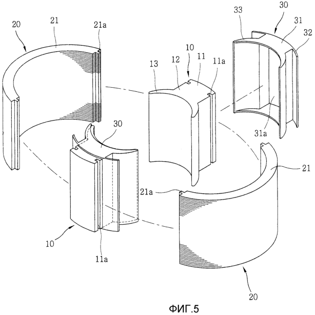 Как показано на фиг.5, узел статора электродвигателя, соответствующий настоящему изобретению, содержит множество ярм 20, изготовленных путем наслаивания множества стальных листов, имеющих предварительно определенную длину, множество полюсов 10, заключенных между ярмами 20 и изготовленных путем формования магнитного материала с помощью пресс-формы, и множество каркасных тел 30, на которые намотаны обмотки для генерирования индукционного магнетизма и которые надеты на внешнюю часть полюсов 10. Полюс 10 содержит направляющую часть 13 дугообразной формы для сбора потока на внутренней части полюса, причем эта направляющая часть 13 расположена с возможностью образования линии магнитной индукции от ротора, который вставлен внутрь статора.
