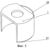 В воплощении формующего узла, представленного на фиг.3 и фиг.4, и матрицы на фиг.2 серпообразный контур отверстий 5 (фиг.2) и подобные ему серпообразные поперечные сечения пуансонов 13 и 14 определяют форму полуфабрикатов, удобную для формования пельменей с ручной долепкой для придания им традиционной формы путем соединения уголков сформованных на устройстве изделий. Серпообразный контур поперечного сечения формующего и обрезного пуансонов (и, соответственно, ячеек матрицы 1) обеспечивает возможность расположения формующих узлов в одном ряду плотно друг к другу (фиг.6) для гарантированного уменьшения количества обрезков теста, называемых облоем. Обрезной пуансон 13 (фиг.5) в этом случае выполнен в виде стакана, цилиндрическая поверхность которого содержит плоский срез по всей его высоте, образуя в боковой поверхности открытый участок (прямой цилиндр с отсеченной по вертикали частью). При этом в его верхней (донной) части противоположно срезу выполнен вырез 28 по ширине отсеченной части, высота которого несколько превышает толщину донной части обрезного пуансона.