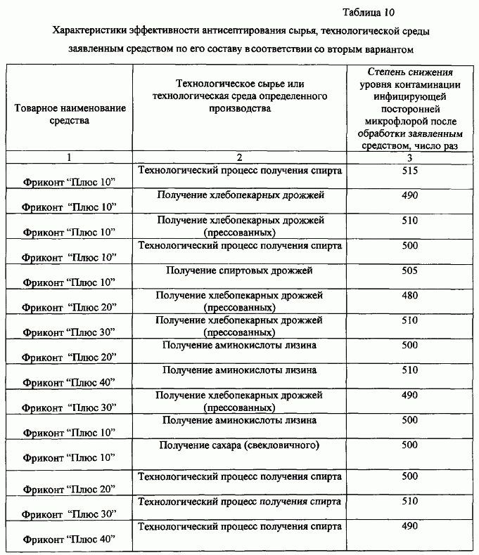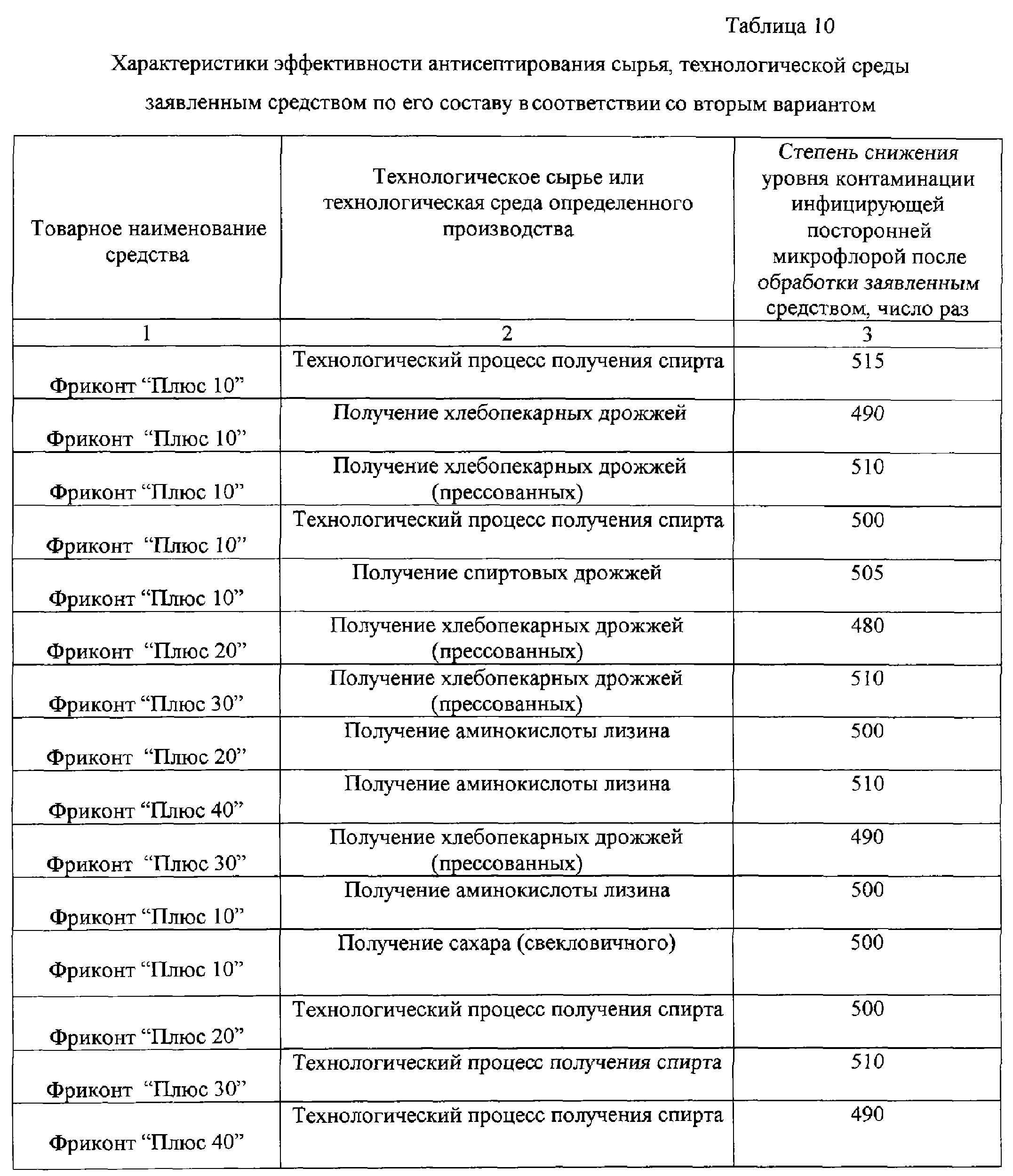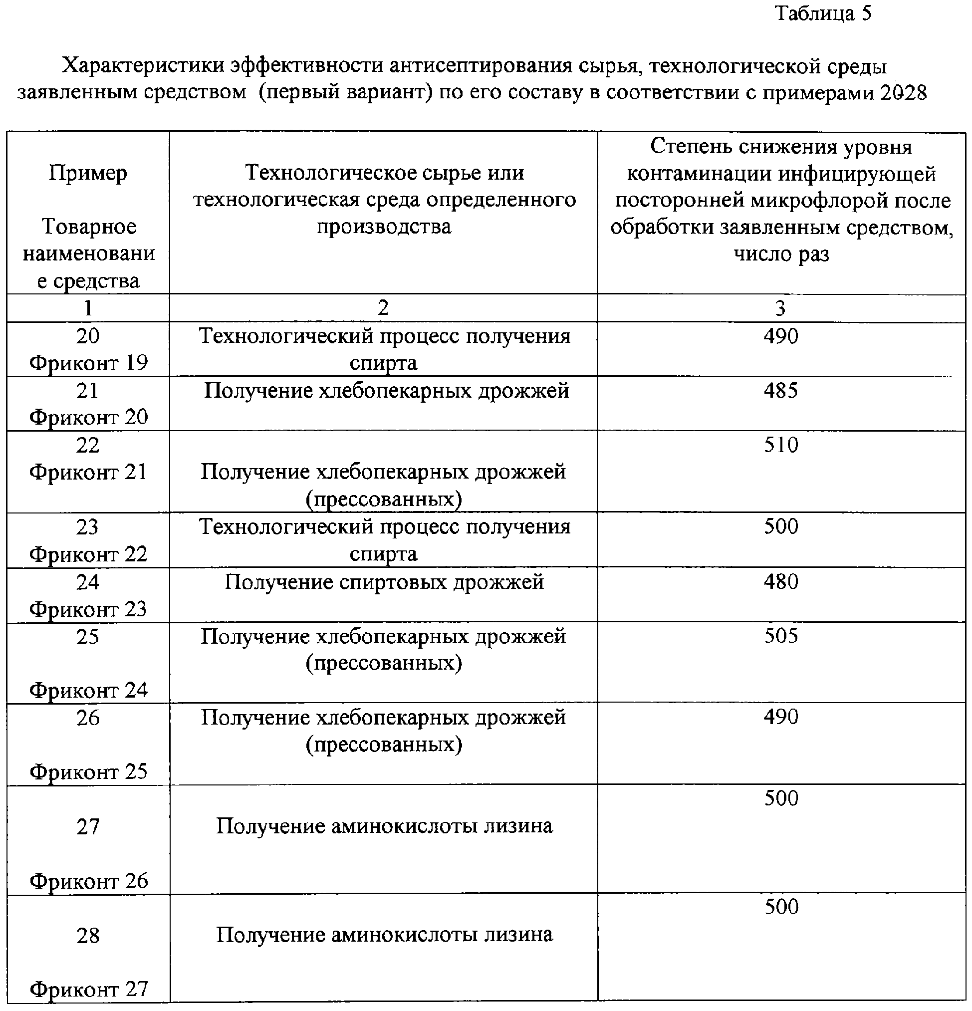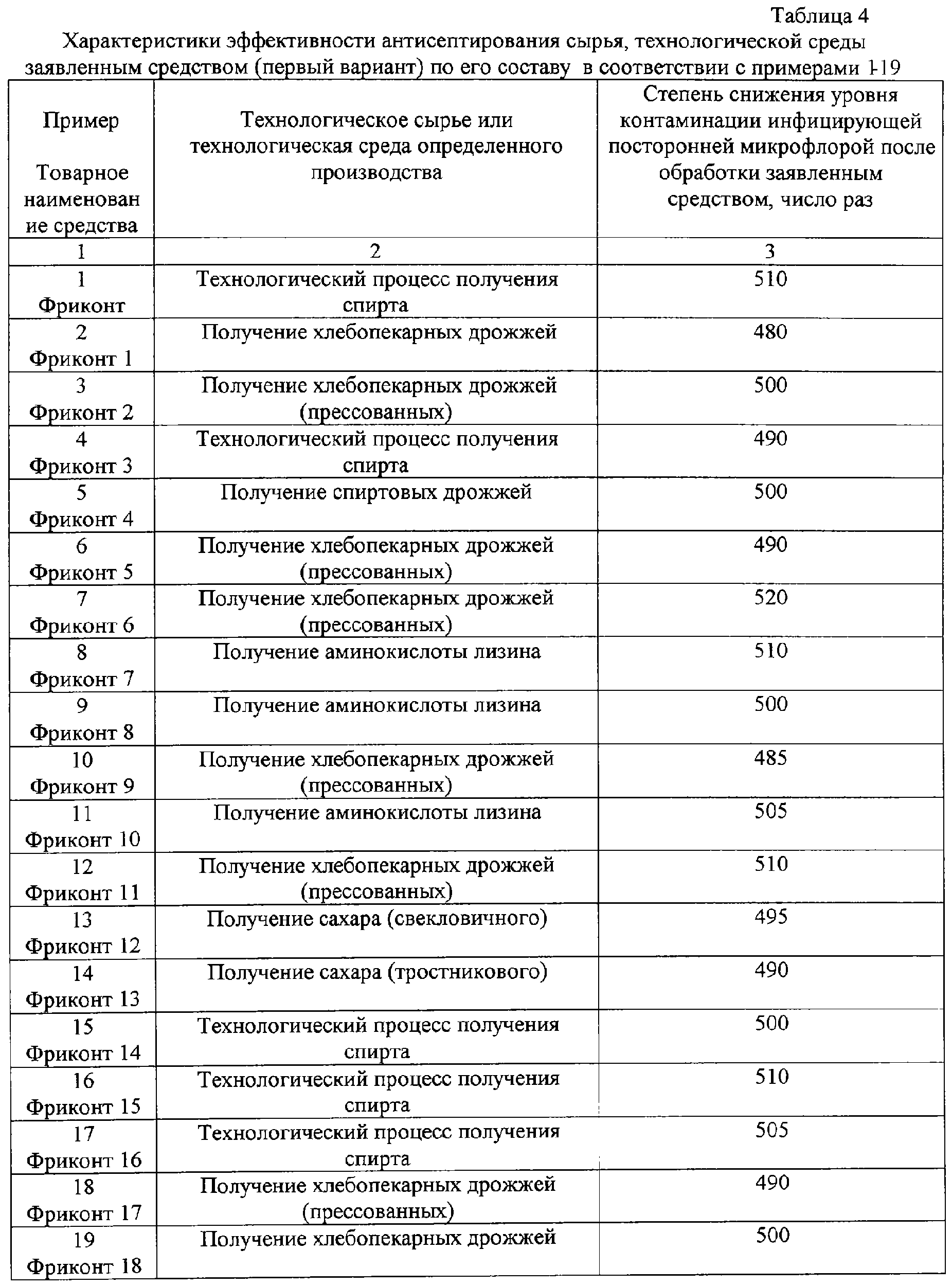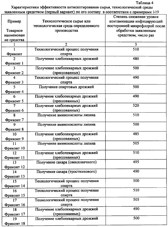 Примеры 2-28 осуществляют, как пример 1, но по качественным и количественным характеристикам заявленного состава, которые приведены в таблицах 2 и 3. Характеристика других компонентов антибиотической составляющей заявленного состава. Бензилпенициллин калия (бензилпенициллина калиевая соль), benzylpenicilinum-calium, (2S, 5R, 6R)-3,3-диметил-7-оксо-6-[(фенилацетил)амино]-4-тиа-1-азабицикло[3.2.0]гептан-2-карбоксилат калия. Эмпирическая формула – C16H17N2КО4S. Имеет направленное бактерицидное действие, то есть способность уничтожать определенный ряд микроорганизмов. Форма выпуска – мелкокристаллический порошок белого цвета. Оксациллин натрия (оксациллина натриевая соль), oxacilinum-natrium, натриевая соль 3-фенил-5-метил-4-изоксазолил-пенициллина моногидрата. Форма выпуска – мелкокристаллический порошок. Имеет направленное бактерицидное действие, то есть способность уничтожать определенный ряд микроорганизмов. Феноксиметилпенициллин (Phenoxymethulpenicillinum), 3,3-Диметил-7-оксо-6-(фенксиацетамидо)-4-тиа-1-азабицикло-[3,2,0]-гептан 2-карбоновой кислоты. Форма выпуска – мелкодисперсный порошок. Имеет направленное бактерицидное действие, то есть способность уничтожать определенный ряд микроорганизмов. Эффективность антисептирования сырья, технологической среды заявленным средством в соответствии с примерами 1-28 приведена в таблицах 4 и 5: показано снижение степени инфицирования сырья и технологической среды (графа 3 таблицы 4, графа 3 таблицы 5) по средним данным из количества результатов для статистической обработки; контрольные испытания проводились путем определения КОО (колоний образующих единиц) в см3 МПБ (мясопептонного бульона).