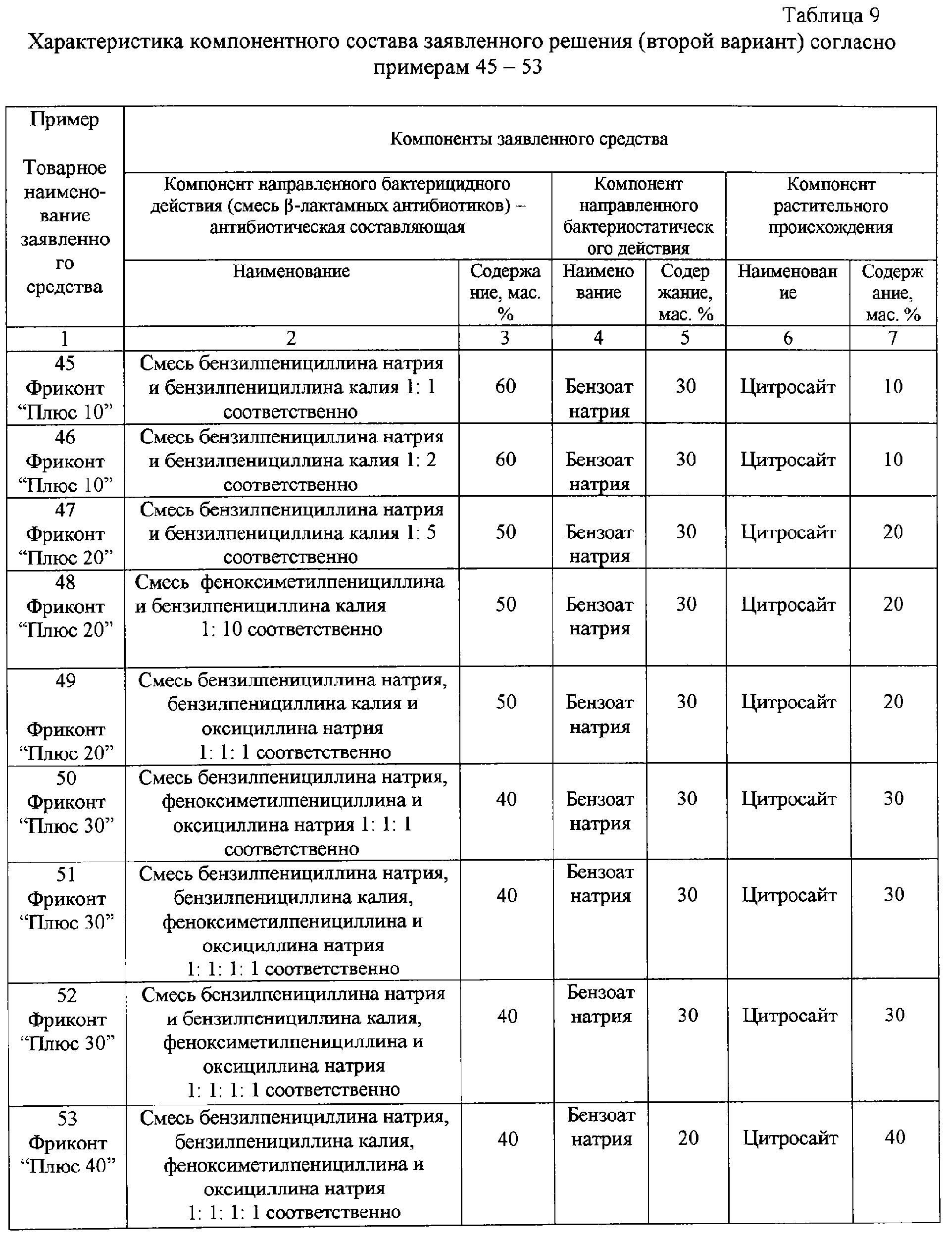 Примеры 30-53 осуществляют, как пример 29, но в соответствии с качественными, количественными характеристиками заявленного средства, которые приведены в таблицах 8 и 9. Характеристика других компонентов антибиотической составляющей. Бензилпенициллин калия (бензилпенициллина калиевая соль), benzylpenicilinum-calium, (2S, 5R, 6R)-3,3-диметил-7-оксо-6-[(фенилацетил)амино]-4-тиа-1-азабицикло[3.2.0]гептан-2-карбоксилат калия. Эмпирическая формула – C16Н17N2KO4S. Имеет направленное бактерицидное действие, то есть способность уничтожать определенный ряд микроорганизмов. Форма выпуска – мелкокристаллический порошок белого цвета. Оксациллин натрия (оксациллина натриевая соль), oxacilinum -natrium, натриевая соль 3-фенил-5-метил-4-изоксазолил-пенициллина моногидрата. Форма выпуска – мелкокристаллический порошок. Имеет направленное бактерицидное действие, то есть способность уничтожать определенный ряд микроорганизмов. Феноксиметилпенициллин (Phenoxymethulpenicillinum), 3,3-Диметил-7-оксо-6-(фенксиацетамидо)-4-тиа-1-азабицикло-[3,2,0]-гептан -2-карбоновой кислоты. Форма выпуска – мелкодисперсный порошок. Имеет направленное бактерицидное действие, то есть способность уничтожать определенный ряд микроорганизмов.