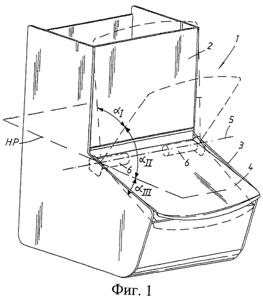 На фиг.1 показан прозрачный контейнер 1 для сладостей, имеющий вертикальную загрузочную секцию 2 и секцию 3 самообслуживания, выступающую наружу от загрузочной секции 2. Секция 3 самообслуживания ограничена по высоте, полностью или частично, плоской прозрачной крышкой 4, установленной на цапфах с возможностью поворота вокруг по существу горизонтальной оси 5, расположенной вблизи загрузочной секции 2, которая тоже имеет крышку (не показана). Как видно из чертежа, благодаря расстоянию между осью 5 и вертикальной загрузочной секцией 2 крышка, полностью отведенная вверх, находится под таким углом, что удерживается в открытом положении под действием собственного веса, если на нее не будут действовать другие силы. В изображенном варианте крышка в закрытом положении наклонена к загрузочной секции под косым углом. Угол перемещения крышки между полностью открытым и полностью закрытым положениями составляет 90-170°. Этот угол делится на три части: I, II, III, где I соответствует начальной фазе перемещения из полностью открытого (откинутого вверх) положения до положения, в котором крышка продолжает закрываться под действием собственного веса. II соответствует первой фазе закрывания от положения, в котором закрывание крышки происходит под действием собственного веса, до воображаемой горизонтальной плоскости HP, проходящей через ось 5, и III обозначает угол между этой горизонтальной плоскостью и крышкой в полностью закрытым положении. Все названные положения показаны на чертеже штриховыми линиями. Угол II лежит в пределах 20°-40°. На каждой стороне крышки 4 между ней и секцией 3 самообслуживания расположено устройство 6 для закрывания, установленное в полостях на заднем крае крышки, которые проходят внутрь, к центру крышки вдоль ее оси 5.