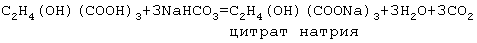 Взаимодействие лимонной кислоты и бикарбоната натрия в водной среде будет протекать следующим образом: