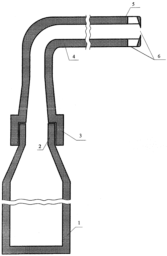 Устройство для введения в полостные образования лекарственных веществ с пеной схематично изображено на чертеже. Оно имеет емкость 1 с горловиной 2, крышку 3 с катетером 4, заканчивающимся концом 5 с несколькими отверстиями 6.