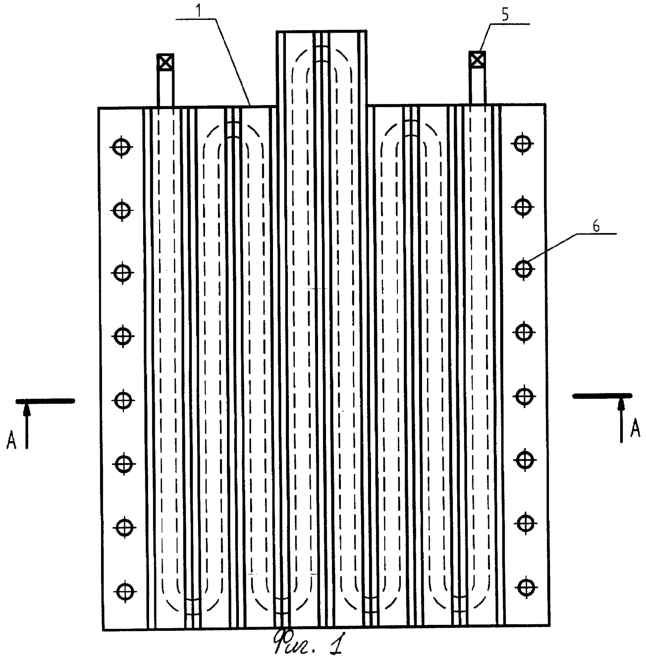 Предлагаемое устройство представляет собой замкнутую оболочку 1 из эластичного герметичного материала, которая имеет перегородки 2 и выполнена в форме, например, прямоугольника. Внутри оболочки по всей длине и ширине, между перегородками, находится трубка 3 из эластичного материала, например, резины. Расстояние между перегородками составляет 1/10 ширины оболочки. Внутри трубки размещен жгут 4 из эластичного материала, диаметр которого составляет 1/5 диаметра трубки. Жгут исключает перегиб трубки под весом больного и обеспечивает непрерывную циркуляцию воды. Концы трубки снабжены штуцерами 5 для подключения к теплообменнику. На боковых кромках устройства выполнены отверстия 6 для стяжных лент (фиг.1-2).