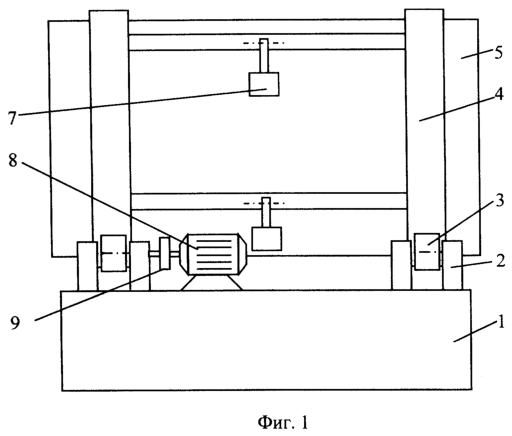 От электродвигателя 8 посредством механической передачи 9 вращение придают одному из опорных тел 3 вращения, цилиндрической раме 4 и эластичному барабану 5. Затем во входную часть вращающегося эластичного барабана 5 подают сыпучий материал, например щебень, и вязкий материал, например битумную эмульсию. При вращении смешиваемый материал подхватывается боковой стенкой эластичного барабана 5, поднимается вверх и падает обратно. Благодаря тому, что барабан 5 установлен с наклоном оси в горизонтальной плоскости, материал смешивается и одновременно перемещается к его выходной части. При вращении барабана 5 некоторые из ударных элементов 7 осуществляют механическое воздействие на его боковую стенку путем нанесения удара, изменяя кривизну боковой стенки эластичного барабана 7 в плоскости, перпендикулярной оси вращения, что способствует отделению налипшего материала от боковой стенки и его дальнейшему участию в перемешивании.