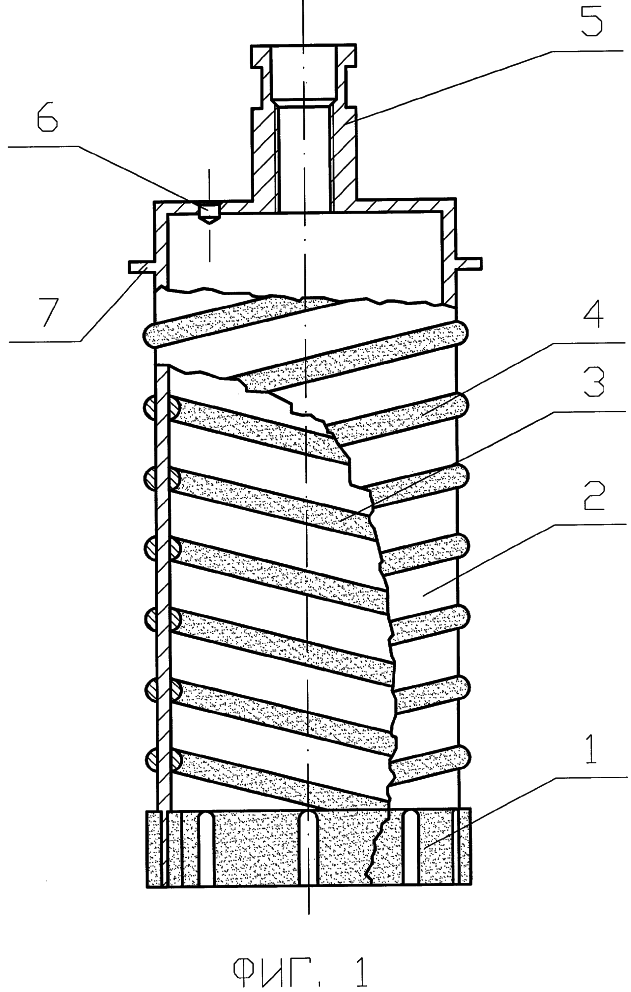 На фиг.1 изображен преложенный инструмент, состоящий из режущей алмазной коронки 1 в нижней части цилиндрического корпуса 2, который имеет внутренний 3 и наружный 4 шнеки, имеющие взаимно противоположные направления, в верхней части цилиндрического корпуса хвостовик 5, в донышке которого имеется заглушка 6, и стопорное кольцо 7, ограничивающее рабочий ход инструмента.
