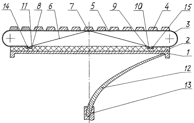 При этом брекер может быть включен в высоту протектора, что позволяет свести к минимуму содержание в нем резины 4, таким образом уменьшить массу. Кроме того, чем ниже профиль шины, то есть чем меньше радиус боковин в меридианальном сечении, тем меньше сопротивление качению. Нагрузка на боковины шины от действия газовых сил также уменьшается за счет уменьшения их высоты, поэтому их можно сделать тоньше, при этом потери в них при перекатывании будут меньше.