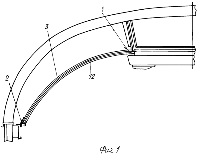 Продольный зазор 14, по меньшей мере, равен глубине малого приемного паза 4. Сумма глубины большого приемного паза 5 и интервала между нижними противостоящими полками 8, 9 дуг в рамке имеет несколько большую величину, чем длина потолочной панели 12 (рассматривается по оси вагона).