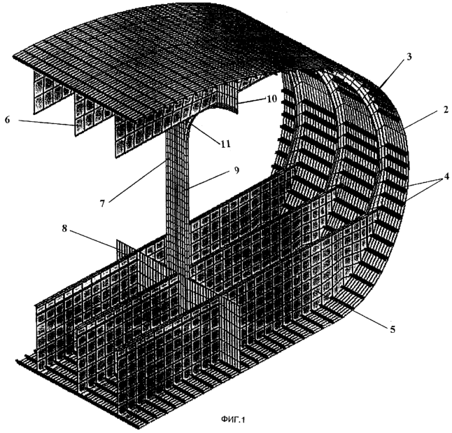 В связи с указанной задачей настоящего изобретения в фюзеляж 1 введены расположенные по боковым сторонам продольные силовые конструкции 7 арочного типа, подкрепляющие верхнюю и нижнюю части фюзеляжа. Расположение продольных силовых конструкций 7 диктуется условиями компоновки и весовой оптимизацией конструкций шпангоутов. В частности, они могут быть установлены вблизи перехода по существу плоской части фюзеляжа в его закругленную часть. Каждая продольная силовая конструкция 7 включает в себя соединенные между собой нижний продольный силовой элемент 8 типа балки, вертикальные стойки 9, установленные по шпангоутам через определенное количество шпаций, например через 2-5 шпаций в зависимости от компоновки, и верхние силовые элементы 10, имеющие арочные элементы 11, расположенные между определенными соседними стойками 9.