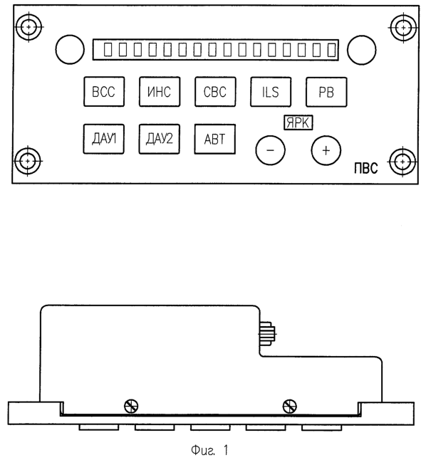 Внешний вид лицевой части пульта показан на фиг.1. На ней имеются кнопки: ВСС; ИНС; СВС; ILS; РВ; ДАУ1; ДАУ2; АВТ; +; -, индикатор на шестнадцать знакомест и два фотодатчика. Кнопка “АВТ” служит для возврата в автоматический режим работы, кнопками “+” и “-” регулируется яркость индикатора пульта. Остальные кнопки выбирают соответствующие системы. Габаритные размеры лицевой части пульта составляют 64×146×43. Существующие на сегодняшний день технологии не позволили разместить в этих размерах всю необходимую аппаратуру. Поэтому формирователь последовательного кода по ГОСТ 18977-79 [1] вынесен в интерфейсную часть. Интерфейсная часть представляет собой отдельный конструктив, к которому подключены две лицевые части, а при необходимости могут быть подключены и другие приборы. В результате использования такого решения удалось снизить глубину прибора (от привалочной плоскости) с обычных 200 до 35 мм. Приборы с такой маленькой глубиной можно устанавливать не только на приборной доске, но даже на внутренней обшивке между силовыми элементами, т.е. освобождается дефицитный внутренний объем кабины пилотов.