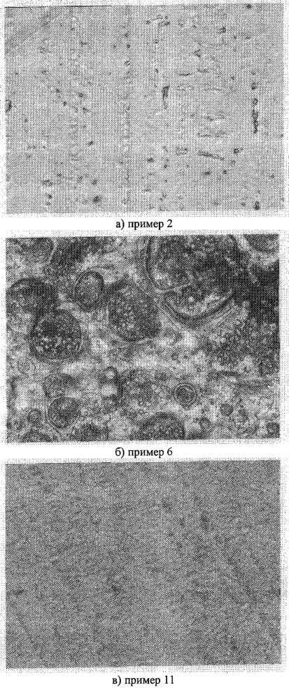 Анализ приведенных данных позволяет считать, что использование предлагаемого способа получения смеси фиброин – хитозан приводит к получению пористого материала с повышенной прочностью (и одновременно регулируемой в зависимости от концентрации и соотношения фиброин : хитозан способностью к набуханию и временем высвобождения лекарственной формы. Так, прочность пористого материала увеличивается с 37,2 (прототип) максимально до 62,4 Н/мм2 (пример 11). Достигается увеличение времени высвобождения лекарства от менее 30 минут (прототип) до 10 часов и более (примеры 10, 11, 13-15), в зависимости от условий получения пористого материала, указанных в формуле изобретения. Указанный эффект обусловлен увеличением степени набухания пористого материала при одновременном увеличении прочности, что позволяет оболочке, не разрушаясь, пропускать лекарство через поры, количество которых зависит от соотношения компонентов смеси и концентрации их в растворе. При изучении пористого материала в условиях набухания под микроскопом при увеличении 40-100 раз обнаружено качественное изменение системы пор, их размеров и геометрии в зависимости от параметров материала. На чертеже приведены фотоснимки пористых материалов, полученных по примерам №2, 6 и 11 соответственно. Видно, что при изменении соотношения фиброин : хитозан и концентрации их в ГФИП существенно меняются размеры, количество и геометрия пор, что приводит к закономерному изменению механизма выпускания лекарства через них. При сравнении фотографий материалов, полученных по примерам 2 и 6 (концентрация полимеров 2%, соотношение фиброин: хитозан 9:1 в примере 2, 7:3 в примере 6) можно видеть, что изменение соотношения компонентов смеси значительно меняет размеры и количество пор, что в итоге приводит к увеличению набухания материала 6 и увеличивает скорость высвобождения лекарства. Однако это ускорение происходит постепенно: в течение первых 30 минут скорость набухания и высвобождения лекарства материалов 2 и 6 отличается незначительно. Это связано с наличием в материале 6 как большого количества маленьких, так и больших пор. При сравнении фотоснимков материалов, полученных по примерам 6 и 11, когда соотношение компонентов смеси одинаково, а меняется концентрация полимеров (2% в примере 6, 15% в примере 11) можно видеть, что изменение концентрации полимеров приводит к формированию качественно иной системы пор, и соответственно изменяются механизм набухания и скорость выпускания лекарства.