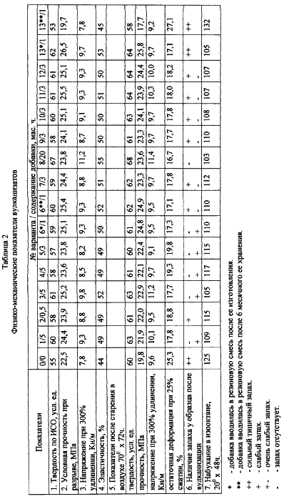 Настоящее изобретение относится к получению резиновой смеси, содержащей серу в качестве вулканизующего агента и конкретно касается добавки к резиновой смеси, улучшающей ее потребительские свойства. Добавка к резиновой смеси содержит соль или смесь солей двухвалентного железа, кадмия, меди, никеля, кобальта, олова, свинца и цинка в виде бромида, нитрата или хлорида (10-40 мас.%), комбинацию органического эфира или эфиров с полигликолем или полигликолями, с температурой их кипения не ниже 150°С и при соотношении эфир : полигликоль от 1:4 до 4:1 (10-25 мас.%), поливинилхлорид (20-55 мас.%) и при необходимости стеарин, каолин или аэросил, взятые по отдельности или в виде смеси (0-45 мас.%). Введение данной добавки в резиновую смесь уменьшает запах вулканизатов из резиновой смеси и повышает одновременно физико-механические свойства вулканизатов. 4 табл.