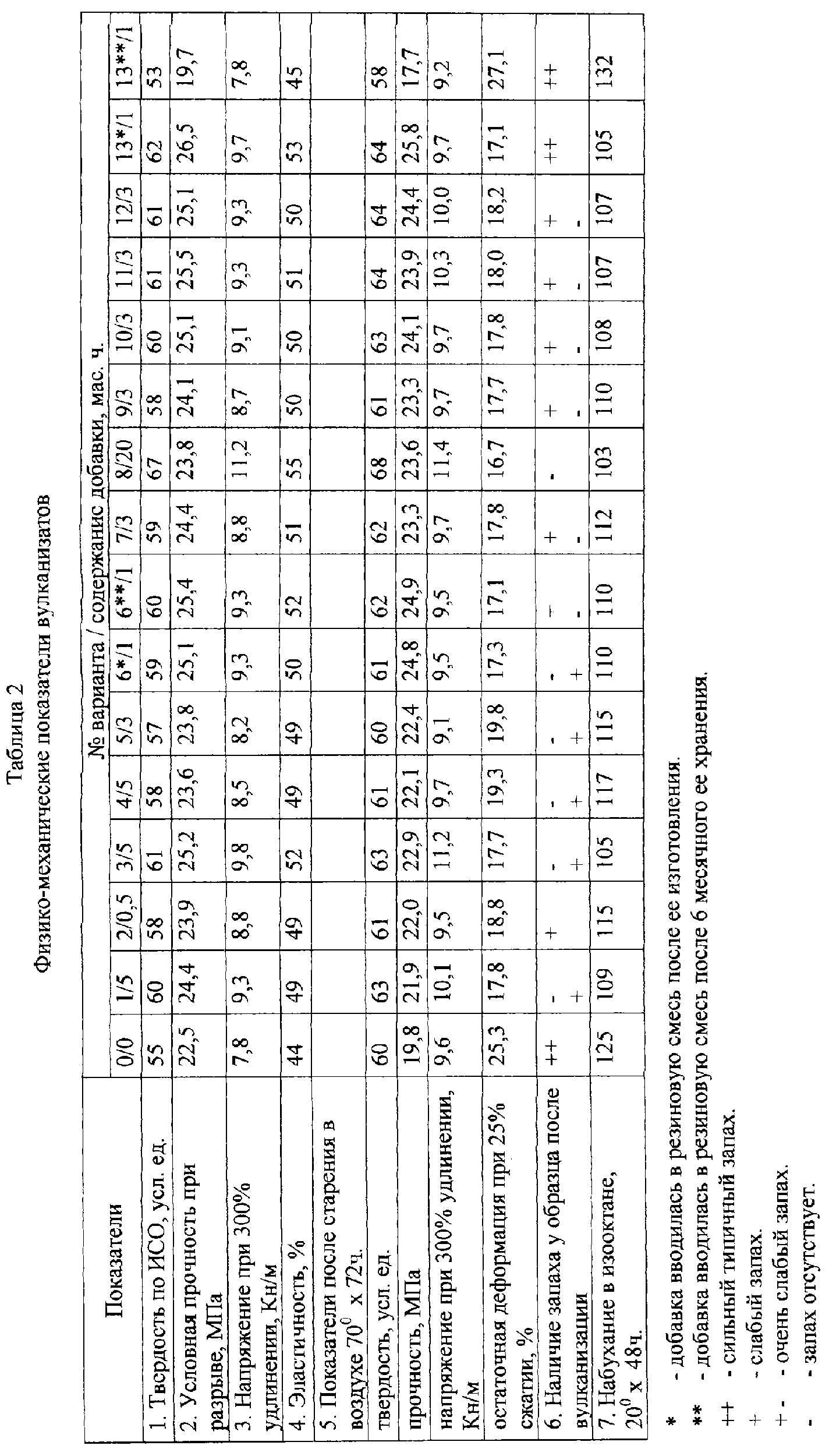 Пример 1. Изготавливаем резиновую смесь следующего состава: СКИ-3 – 100,0; оксид цинка – 3,0; стеарин – 2,0; ацетонанил – 2,0; диафен ФП – 1,0; техуглерод П 324 – 40,0; сера – 2,5; альтакс – 1,5; добавка от 0 до 20,0. Состав добавки приведен в таблице 1, содержание добавки в резиновой смеси и физико-механические показатели вулканизатов приведены в таблице 2. Добавка №6 (предлагаемая) и добавка №13 (прототип) вводились в резиновую смесь сразу после ее изготовления (*) и после 6-месячного их хранения (**). Из приведенных данных видно, что в процессе хранения известной добавки она полностью теряет свои свойства, а физико-механические показатели вулканизатов с данной добавкой даже ниже, чем из смеси без добавки, в то время как предлагаемая добавка полностью сохранила свою активность. Пример 2. Изготавливаем резиновую смесь следующего состава: СКМС-30АРКМ-15 – 60,0; СКИ-3 – 40,0; оксид цинка – 3,0; стеарин – 1,0; диафен – 0,5; ацетонанил – 2,0; сера – 2,2; сульфенамид – 0,6; альтакс – 1,2; наполнитель – 40,0; добавка №6 (см. таблицу 1) – 0 или 30. В качестве наполнителя смесь №1 содержала П 324 без добавки, №2 – П 324 с добавкой, №3 – П 514 с добавкой, №4 – П 702 – с добавкой, №5 – комбинацию П 324 – 20,0 и 20,0 мела, №6 – комбинацию П 324 (20,0) и Т-900 (20,0), где П 324, П 514, П-702 – технический углерод разных марок. В таблице 3 приведены физико-механические показатели вулканизатов из данной смеси. Из приведенных данных видно, что вулканизаты из смеси с добавкой превосходят по упругопрочностным свойствам вулканизаты без добавки, даже в случае 50% замены активного наполнителя на неактивный. Пример 3. Изготавливаем резиновую смесь следующего состава: БНКС-18АМН – 100,0; оксид цинка – 3,0; ацетонанил – 3,0; П 514 – 50,0; ДБФ – 12,0; сера -1,0; сульфенамид Ц – 2,0; альтакс – 2,2; добавка 0 или 4,0. Добавка, вводимая в резиновую смесь, имела следующий состав: диэтиленгликоль – 5,0; дибутилфталат – 10,0; соль – 35,0; поливинилхлорид – 50,0. В резиновую смесь №1 добавки в качестве соли содержала ZnCl2; №2 – ZnNO3 6Н2О; №3 – ZnSO4 7H2O; №4 – ZnBr2, а смесь №5 – добавку не содержала. В таблице 4 приведены физико-механические показатели вулканизатов. Из приведенных данных видно, что предлагаемая добавка уменьшает или устраняет характерный для вулканизатов запах и увеличивает их твердость, условную прочность при разрыве, напряжение при заданном удлинении, снижает набухание вулканизатов в углеводородах и уменьшает остаточную деформацию.