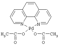 Полимерную композицию и изделия из нее готовят известными приемами, принятыми в производстве фенопластов и изделий из них. Пористые углеродные изделия получают путем карбонизации изделий из ПК известным способом. Свойства известной композиции приведены в таблице. (Авторская заявка №2003105192/04 (005411) Полимерная композиция для пористых углеродных изделий. С 01 В 31/02. Решение о выдаче патента от 13.10.2004 г.) Недостатком известного решения является относительно низкая удельная прочность получаемых пористых углеродных изделий. Техническим результатом предлагаемого изобретения является повышение удельной прочности изделий из пористого углерода. Данный технический результат достигается тем, что полимерная композиция для пористых углеродных изделий содержит пульвербакелит на основе феноло-формальдегидной смолы, отвержденную фенолоформальдегидную смолу, смазку и в качестве металлоорганического комплекса – фенантролиновый комплекс палладия общей формулы PhenPd(OAc)2 при следующем соотношении компонентов, мас.%: