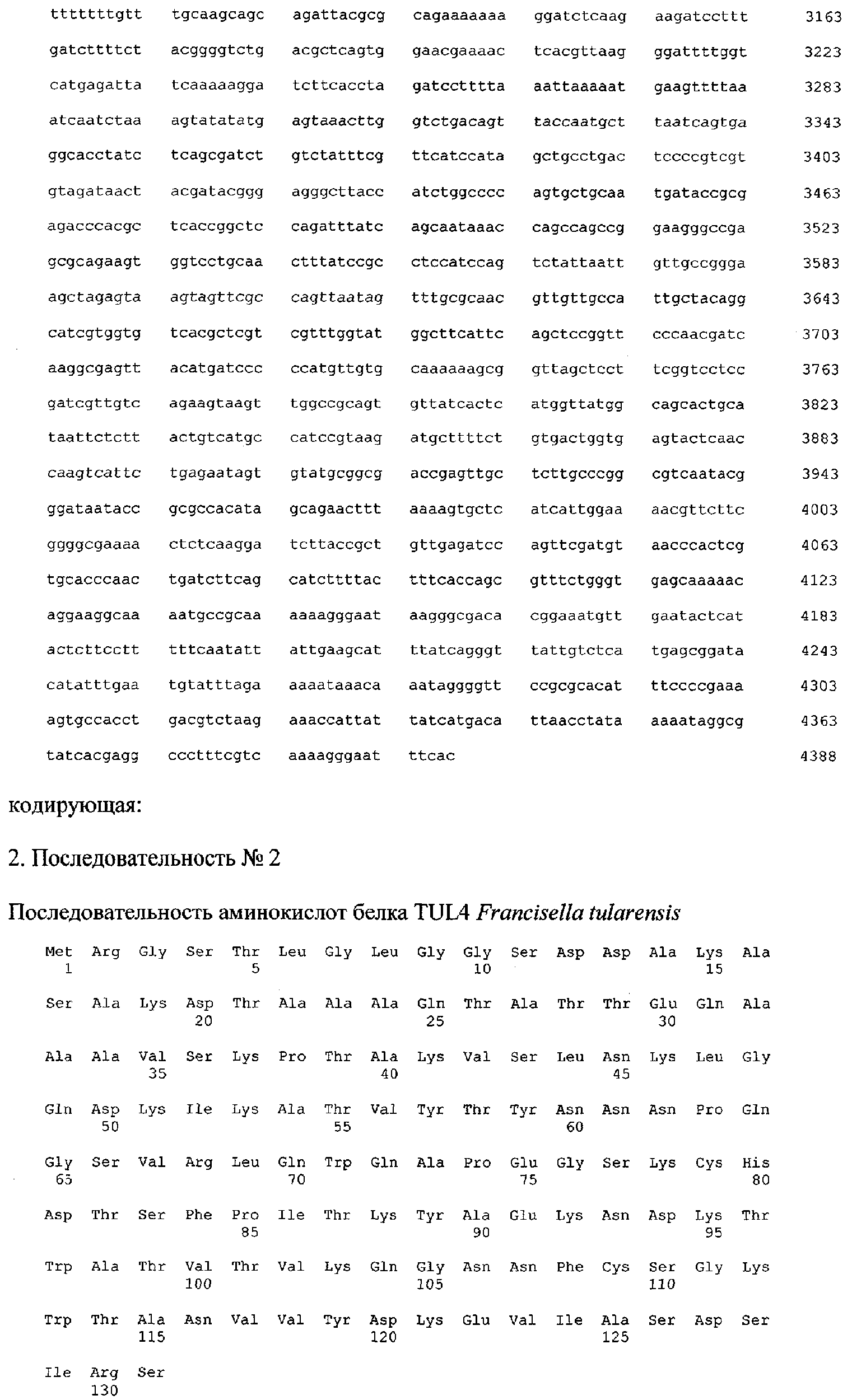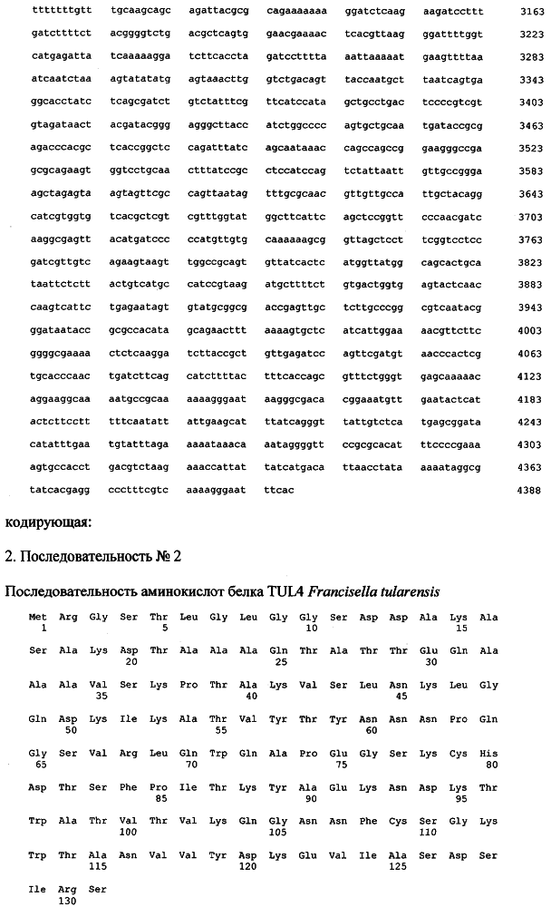 Показано, что белок TUL4 консервативен у различных штаммов F. tularensis (Sjostedt A., Kuoppa К., Johansson Т., Sandstrom G. The 17 kDa lipoprotein and encoding gene of F. tularensis LVS are conserved in strains of F. tularensis. Microb. Pathog., 1992, V.13 (3), Р.243-249), узнается Т-клетками лиц, вакцинированных F. tularensis, некоторые Т-клеточные детерминанты белка TUL4 идентифицированы (Sjostedt A., Sandstrom G., Tarnvik A., Jaurin В. Nucleotide sequence and T cell epitopes of a membrane protein of Francisella tularensis. J. ImmunoL, 1990, V.145 (1), P.311-317).
