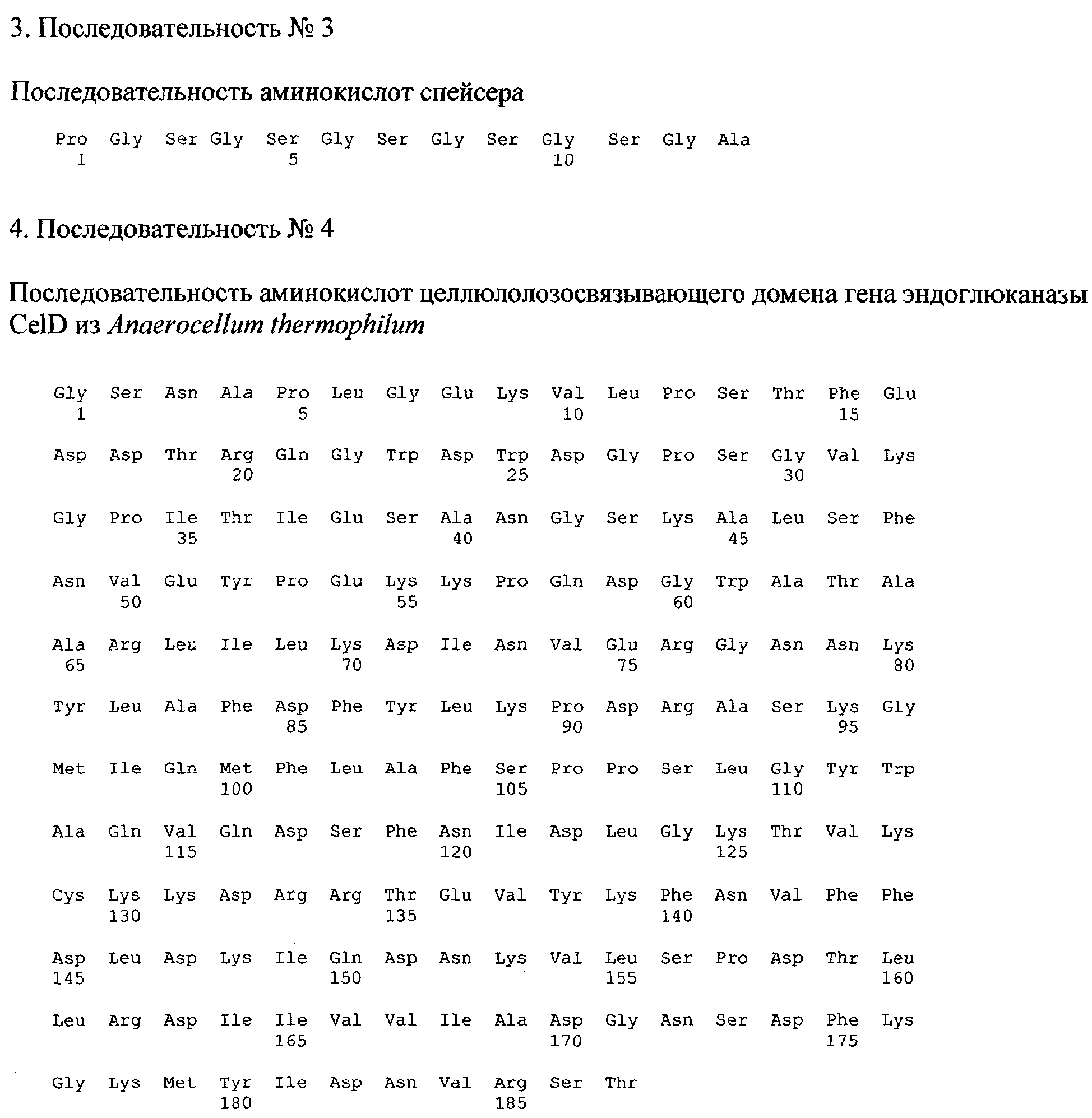 Для получения последовательности спейсера, состоящего из повторов аминокислотных остатков Gly-Ser, были синтезированы два комплементарных олигонуклеотида следующего состава (подчеркнут сайт эндонуклеазы рестрикции BglII, под нуклеотидной последовательностью первого олигонуклеотида приведена кодируемая последовательность аминокислот (последовательность №3):