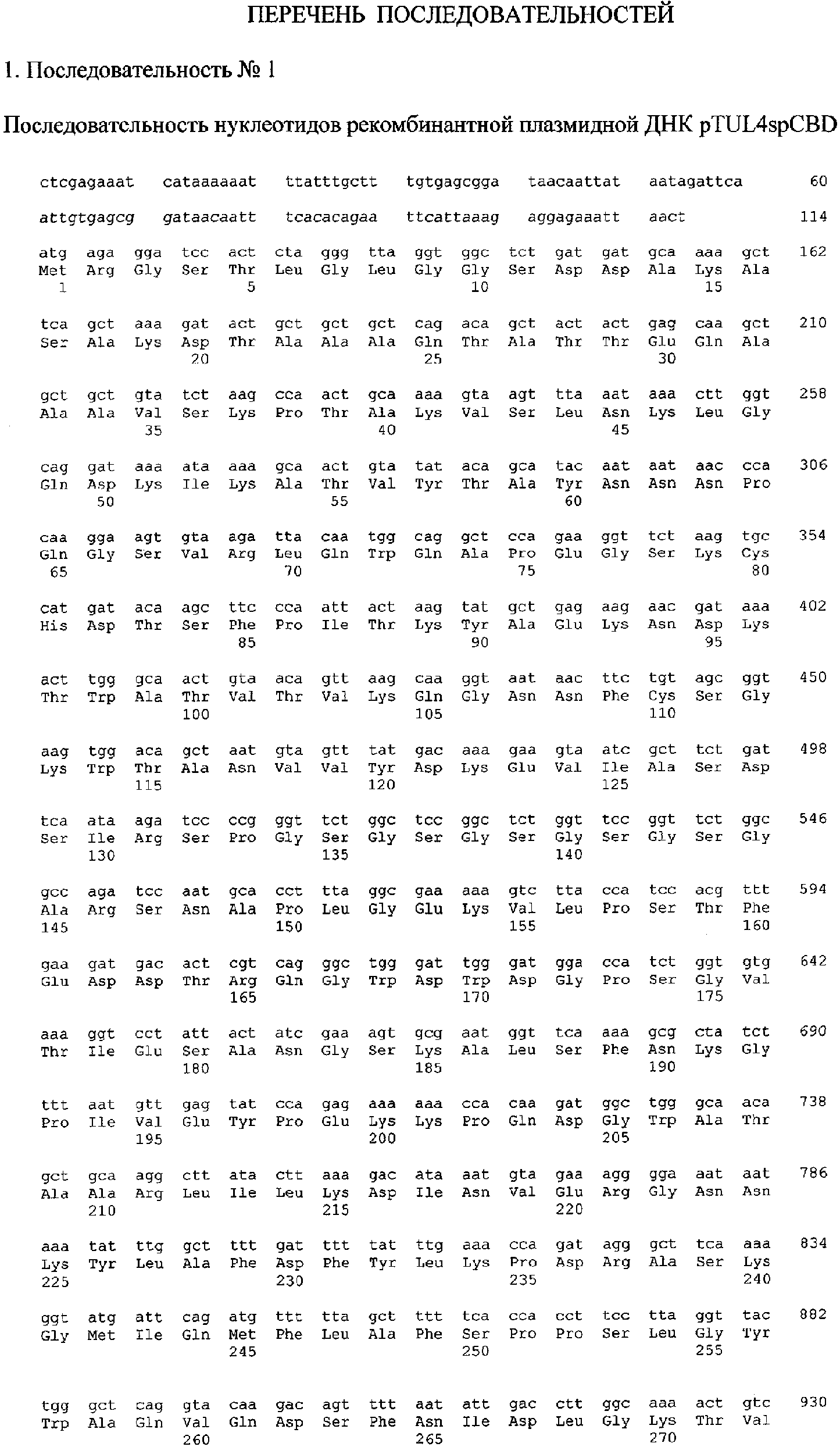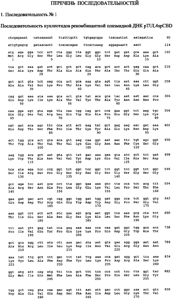 Нуклеотидная последовательность рекомбинантной плазмидной ДНК pTUL4spCBD представлена в последовательности №1.