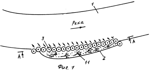 Пространство между железобетонными стволами 6 или деревьями 7 и защищаемым от размыва берегом 2 для ускорения процесса заиления может заполняться деревьями или кустарником 11(фиг.1). В результате заполнения этого пространства деревьям или кустарником 11 сильно снижаются скорости течения потока в этом пространстве и процесс осаждения наносов сильно ускоряется. В результате такого заполнения сильно ускоряется и процесс зарастания кустарником и деревьями этого пространства после заиления.