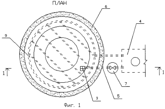 Защита грунта от загрязнения происходит следующим образом. Дождевые стоки попадают в приямок 3 в нижней части каре и по трубопроводу 5 утилизируются в дренажную емкость 4. В случае аварийного разлива опасных веществ из резервуара трубопровод 5 перекрывается задвижкой 8, которая находится в колодце 7. После ликвидации аварии остаточные загрязнения, проникшие в основание резервуара, достигают непроницаемой прослойки 2 и с помощью дренажной системы 9 утилизируются в дренажную емкость 4. Для исключения попадания опасных веществ на окружающую территорию, по периметру насыпной подушки 1 расположена траншея 6, наполненная сменным фильтрующим материалом.
