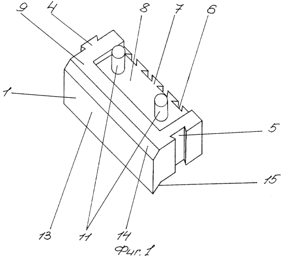 Комплект несъемной опалубки состоит из наружных 1 и внутренних 2 блоков. Наружный 1 и внутренний 2 блоки формованы из термопласткомпозита, например, полимерно-песчаной массы. Но блоки 1 и 2 могут быть изготовлены из любой полимерной массы, где в качестве наполнителя используют такие материалы, как, например, песок, золу тепловых электростанций, бой кирпича, стекла, опилки дерева, солому, виноградную лозу, лузгу подсолнечника, гречихи и т.п. В комплект несъемной опалубки входят также пластинчатые перемычки 3, которые изготовлены в данном случае из металла, но могут быть изготовлены из любого материала, не уступающего по механическим свойствам металлу, например пластика. Каждый наружный 1 и внутренний 2 блоки выполнены с вертикально расположенными на одной из торцевых поверхностей выступом 4 в виде “ласточкина хвоста”. На другой торцевой поверхности наружного 1 и внутреннего 2 блоков выполнен ответный ему паз 5 в виде “ласточкина хвоста”. Обращенные навстречу друг к другу поверхности наружного 1 и внутреннего 2 блоков выполнены с вертикально расположенными рядами чередующихся пазов 6 и 7 в виде “ласточкина хвоста” на всю высоту блоков. На верхней поверхности каждого блока выполнены полости 8, открытые сверху и ограниченные боковыми, соответственно, с внутренней – на внутреннем и с внешней – на наружном блоках стенками 9. Глубина полостей 8 блока принята не менее толщины располагаемых в них пластинчатых перемычек 3. Пластинчатые перемычки 3 имеют на концах отверстия 10. Отверстия 10 пластинчатых перемычек 3 предназначены для того, чтобы с их помощью можно было закреплять наружные 1 и внутренние 2 блоки между собой в рядах блоков. Со стороны полостей 8 расположены выступы 11. В данном случае выступы 11 выполнены цилиндрическими, но они могут быть выполнены и другими, например коническими. Высота выступов 11 превышает глубину полости 8. На противоположной, то есть нижней поверхности каждого блока выполнены соосные выступам глухие отверстия 12. В данном случае глухие отверстия 12 выполнены цилиндрическими, причем диаметр цилиндрического отверстия превышает диаметр выступов 11 со стороны полости блока. Глубина глухих отверстий 12 превышает высоту выступов 11. Со стороны фасадной поверхности 13 только лишь наружного 1 блока выполнена продольно расположенная фаска 14. Продольно расположенная фаска 14 выполнена в верхней части наружного 1 блока. В нижней части только лишь наружного 1 блока выполнен продольно расположенный выступ 15. Продольно расположенный в нижней части наружного 1 блока выступ 15 служит при монтаже опалубки для перекрытия плоскости стыка нижерасполагаемым блоком. В пластинчатой перемычке 3 предусмотрены также отверстия 16, которые служат для того, чтобы на них можно было надеть штырь 17 арматуры. В пластинчатой перемычке 3 предусмотрены также отверстия 18, которые служат для лучшего сцепления с бетоном или пенобетоном после его заливки и затвердевания.